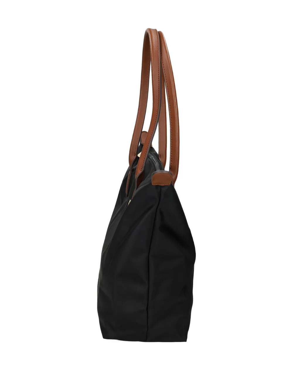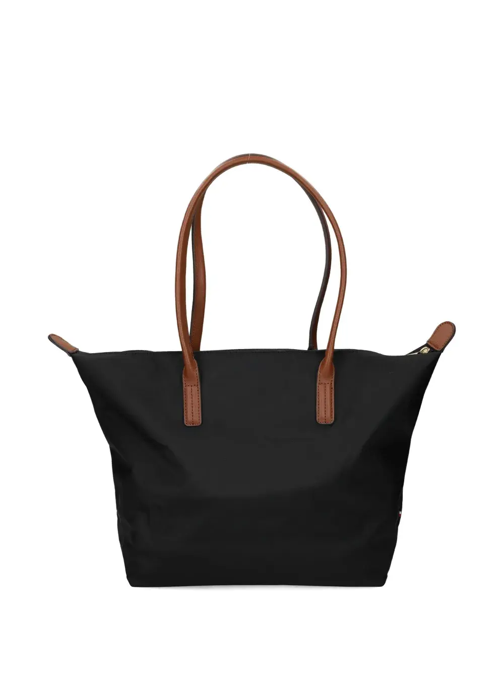 черная сумка с двумя верхними ручками, застежкой-молнией и украшением-логотипом