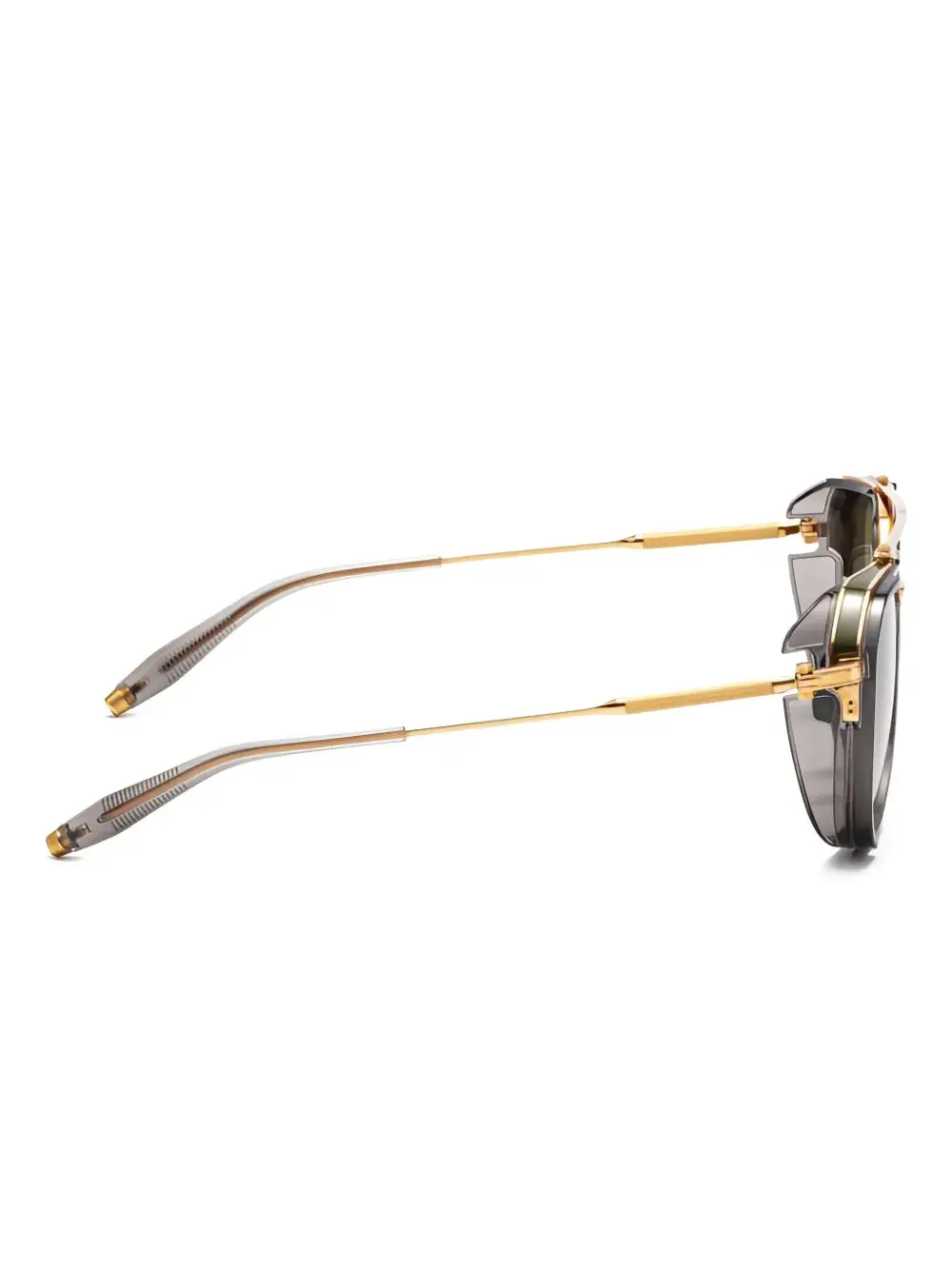 серо-пилотная оправа, двойная перемычка, носовые упоры, фурнитура золотистого цвета, тонированные линзы, очки поставляются с защитным футляром