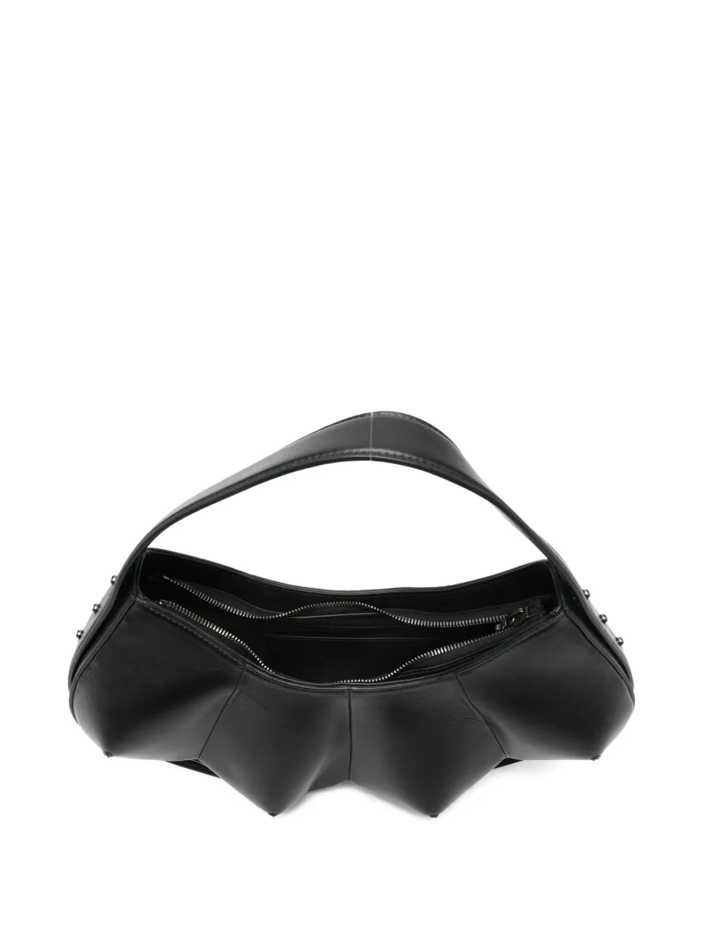 черная сумка с панельным дизайном, верхней ручкой, застежкой-молнией сверху, украшенная заклёпками, к изделию прилагается защитный чехол