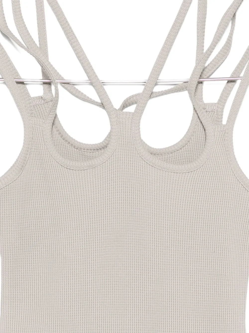серый в рубчик, несколько бретелей, без рукавов, круглый вырез с декоративными прорезями