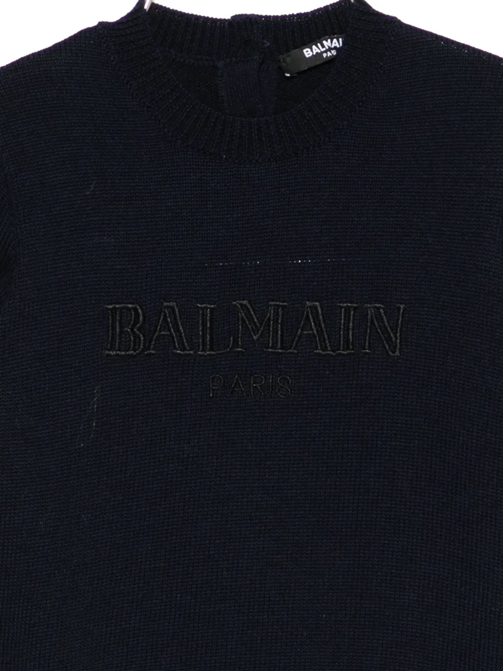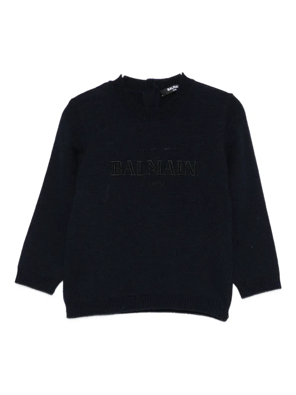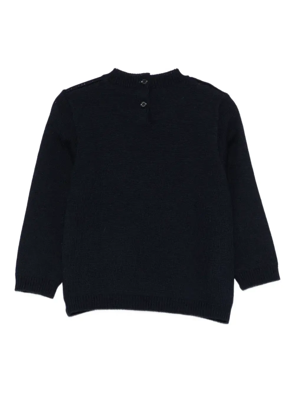 синий цвет, логотип, круглый вырез, длинные рукава, застежка на пуговицы сзади