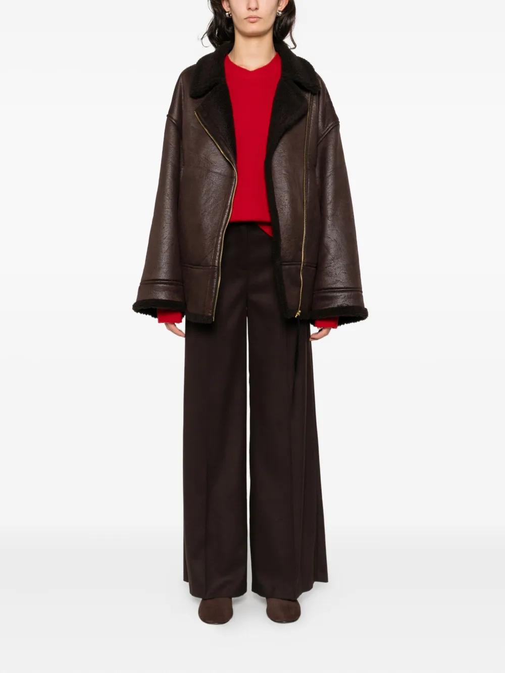 коричневые широкие брюки с передними карманами, шлевками для ремня и скрытой застежкой