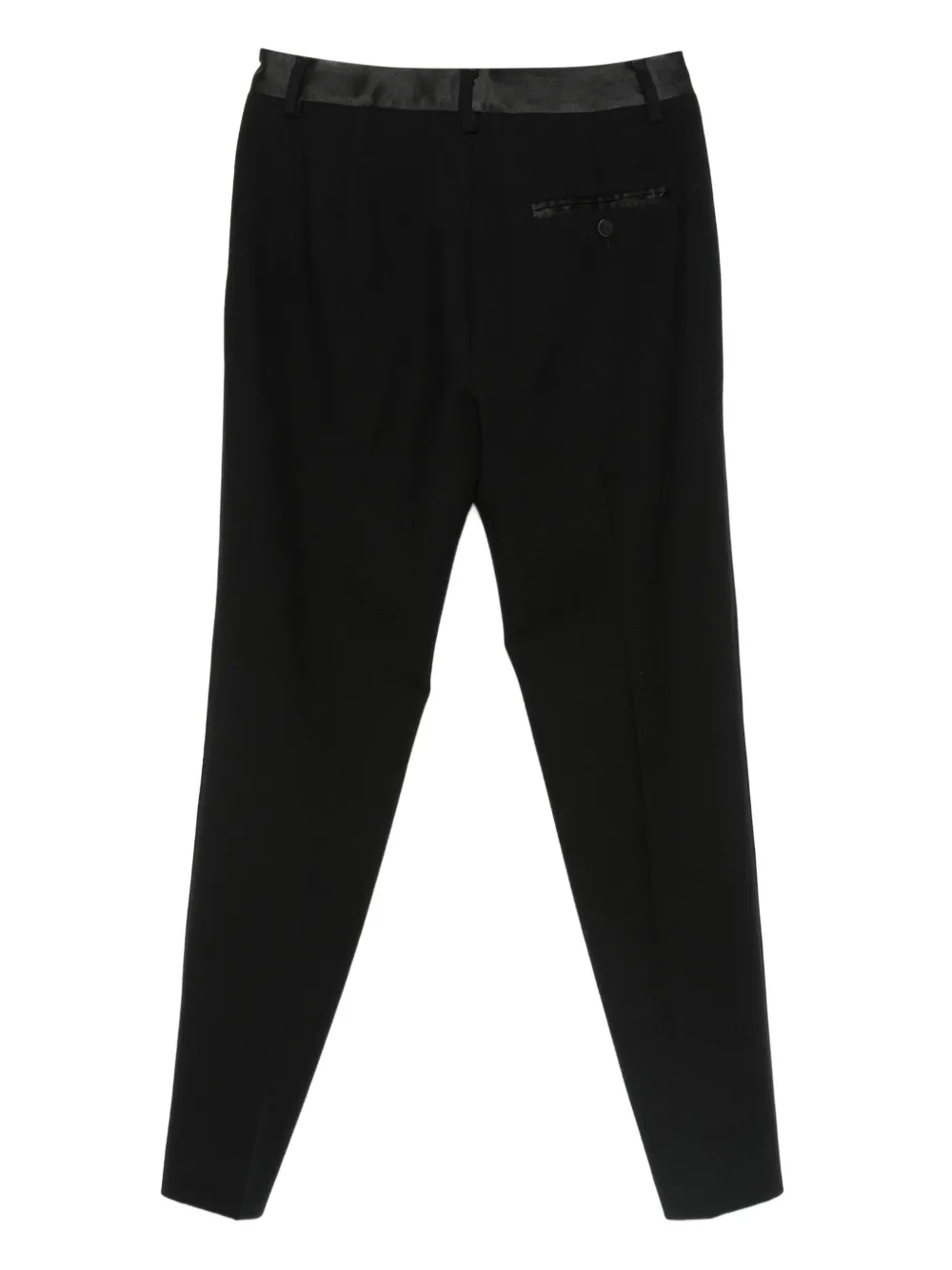 черная атласная тесьма-пояс по бокам, шлевки для ремня, задний прорезной карман, скрытая застежка спереди