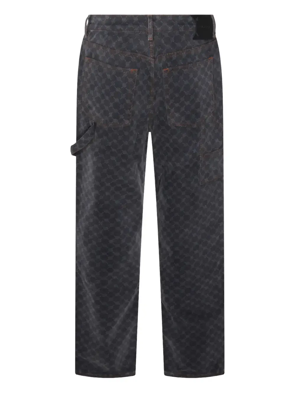 серый цвет, монограммный узор, контрастная отстрочка, боковой ремешок для инструментов, пять карманов, шлевки для ремня