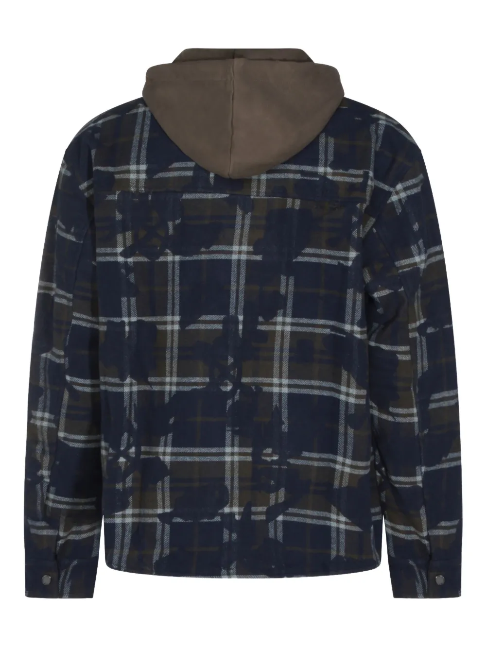 сине-серая рубашка в клетку с коричневым капюшоном, нагрудным карманом, вышитым логотипом и застежкой на пуговицы
