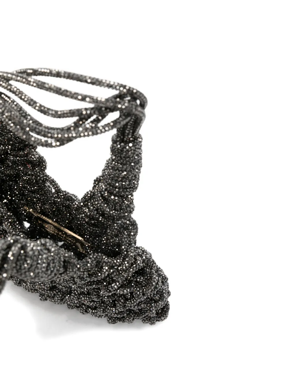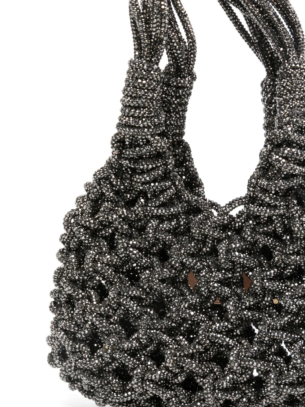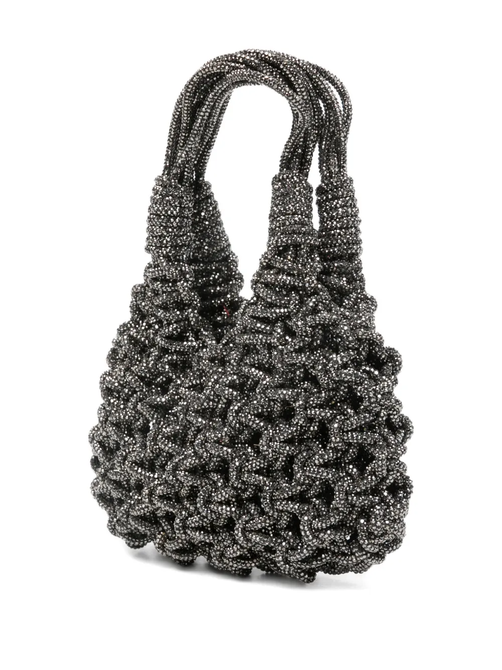 черная сумка с кристаллами, верхняя ручка, открытый верх, в комплекте имеется защитный мешочек для хранения