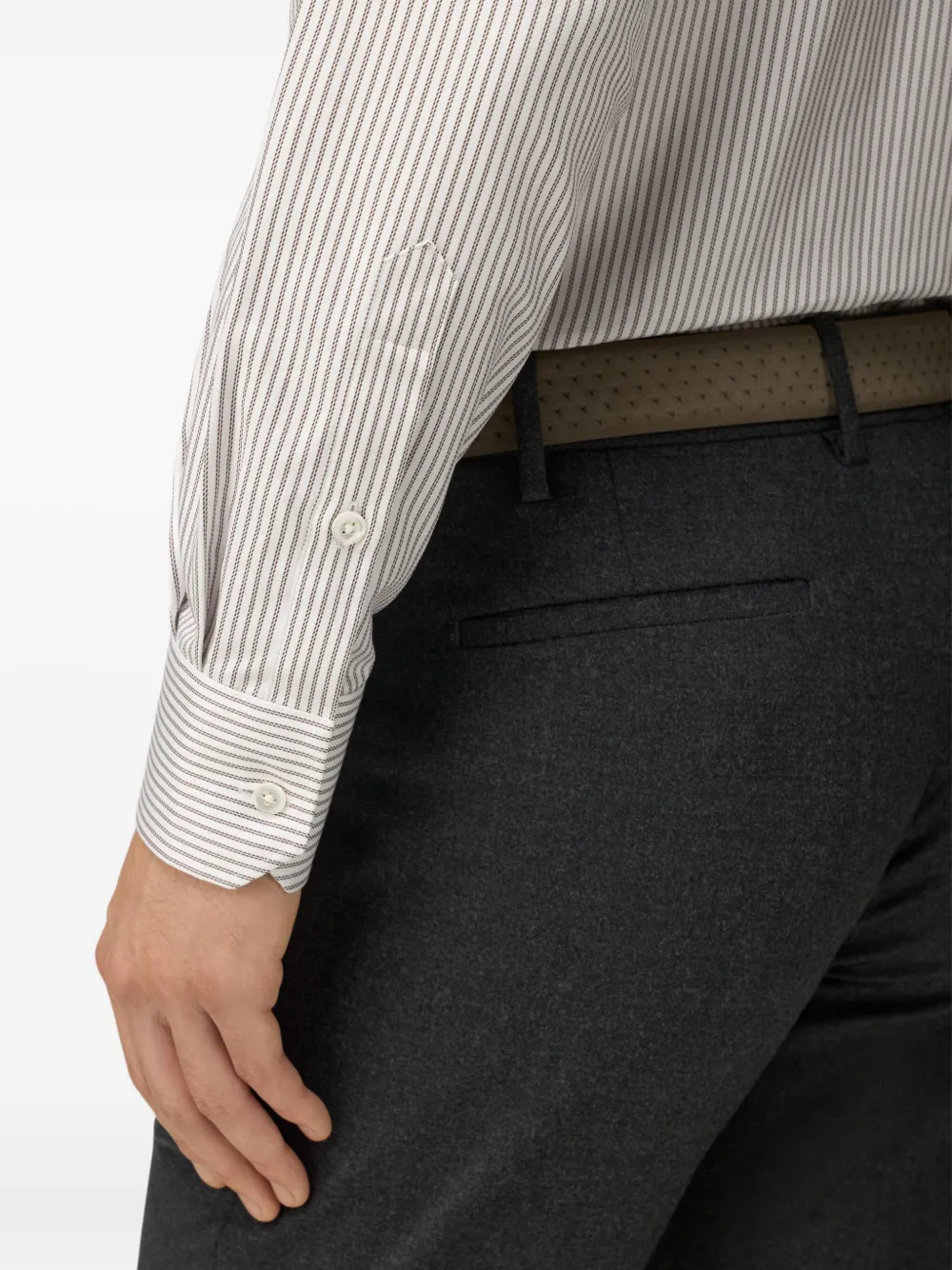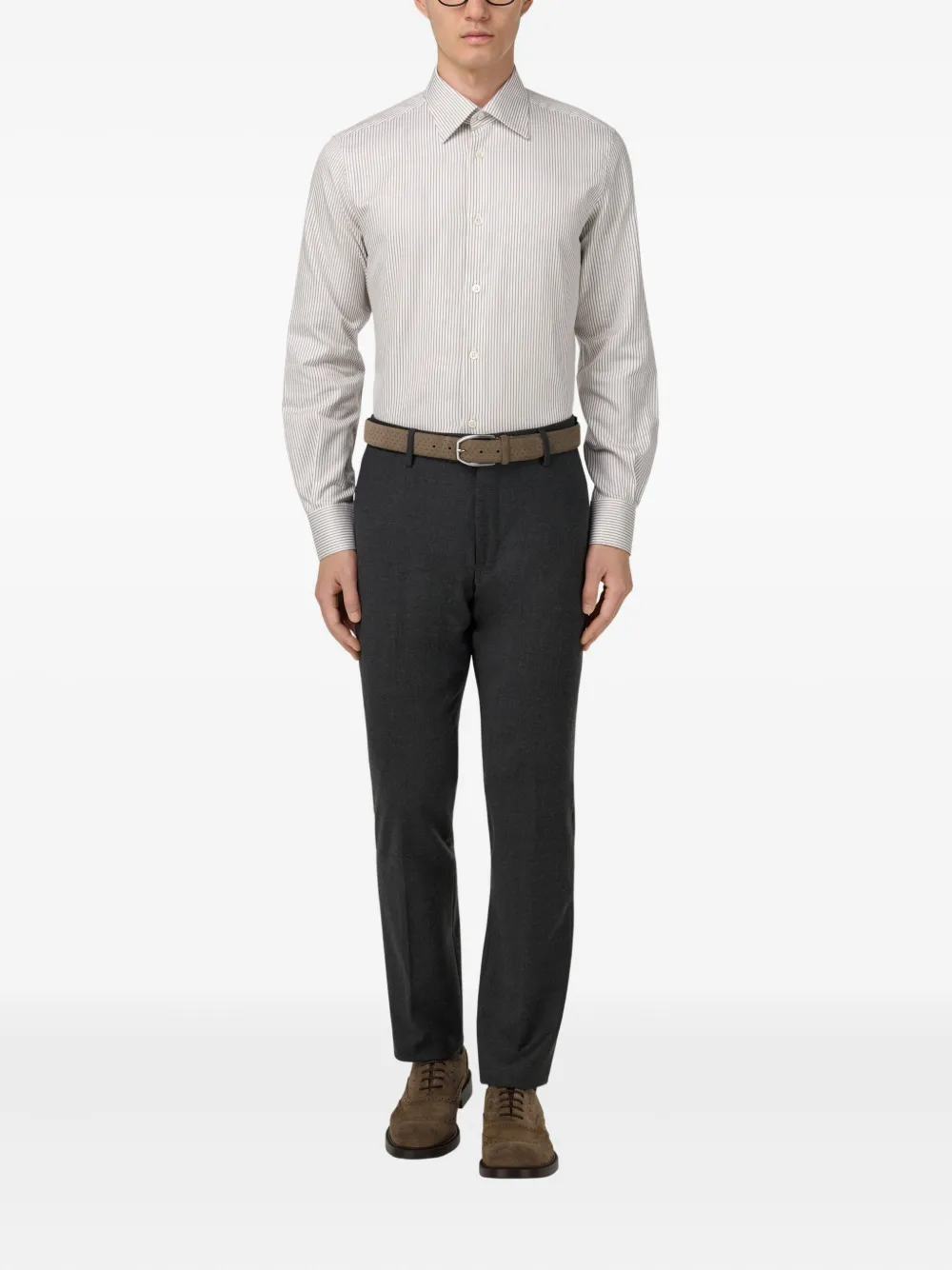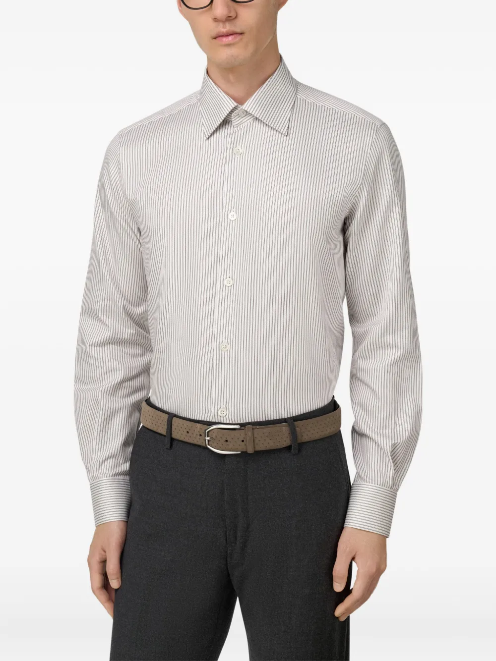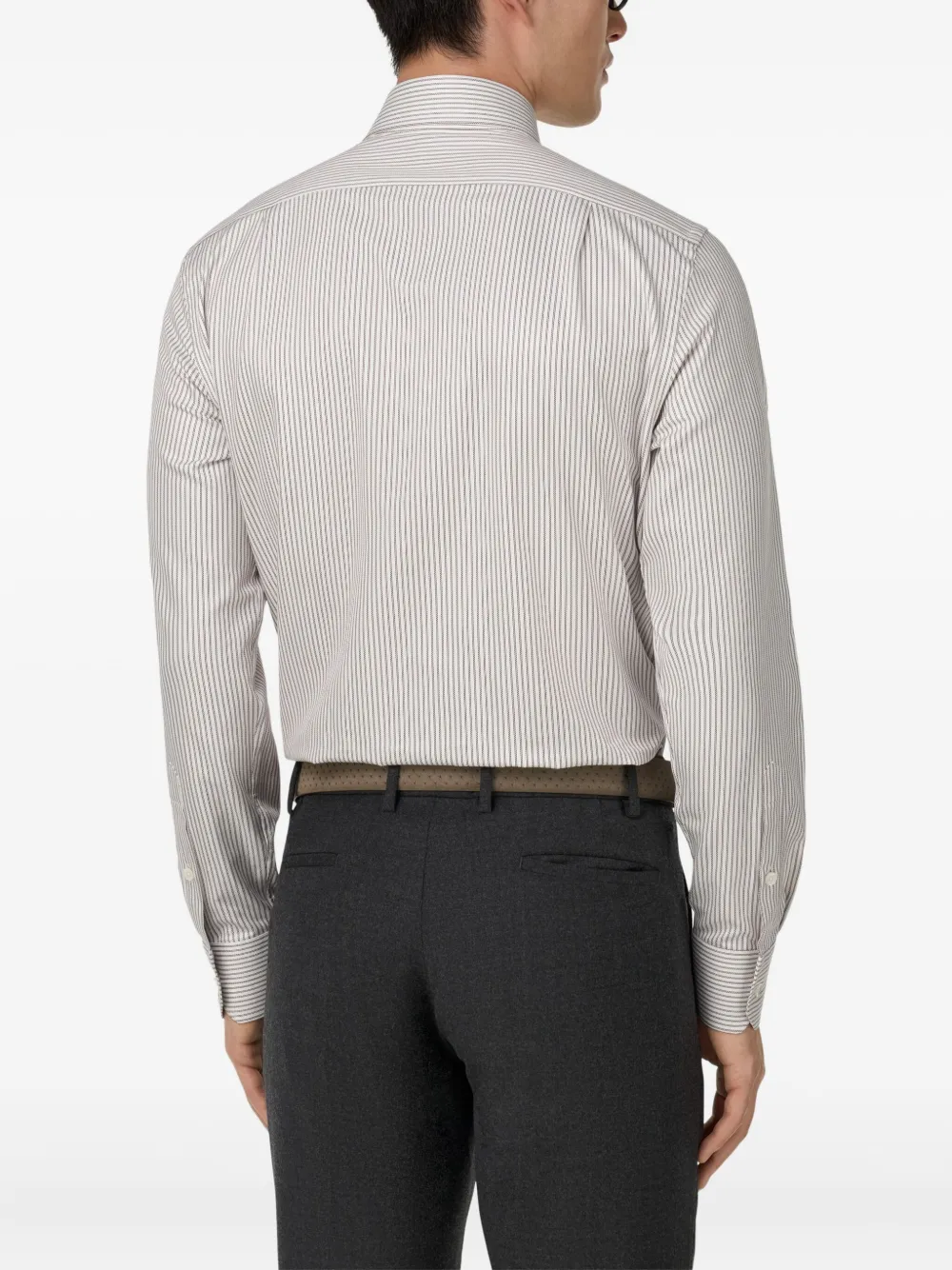 белый и коричневый полосатый узор, классический воротник, застёжка на пуговицы
