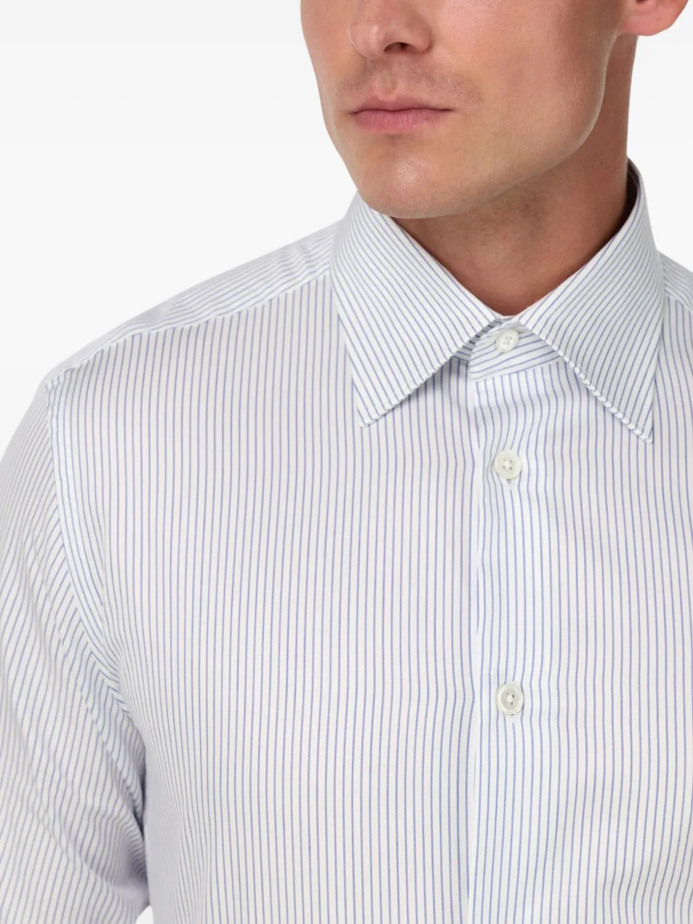 темно-синяя рубашка в полоску с классическим воротником и длинными рукавами