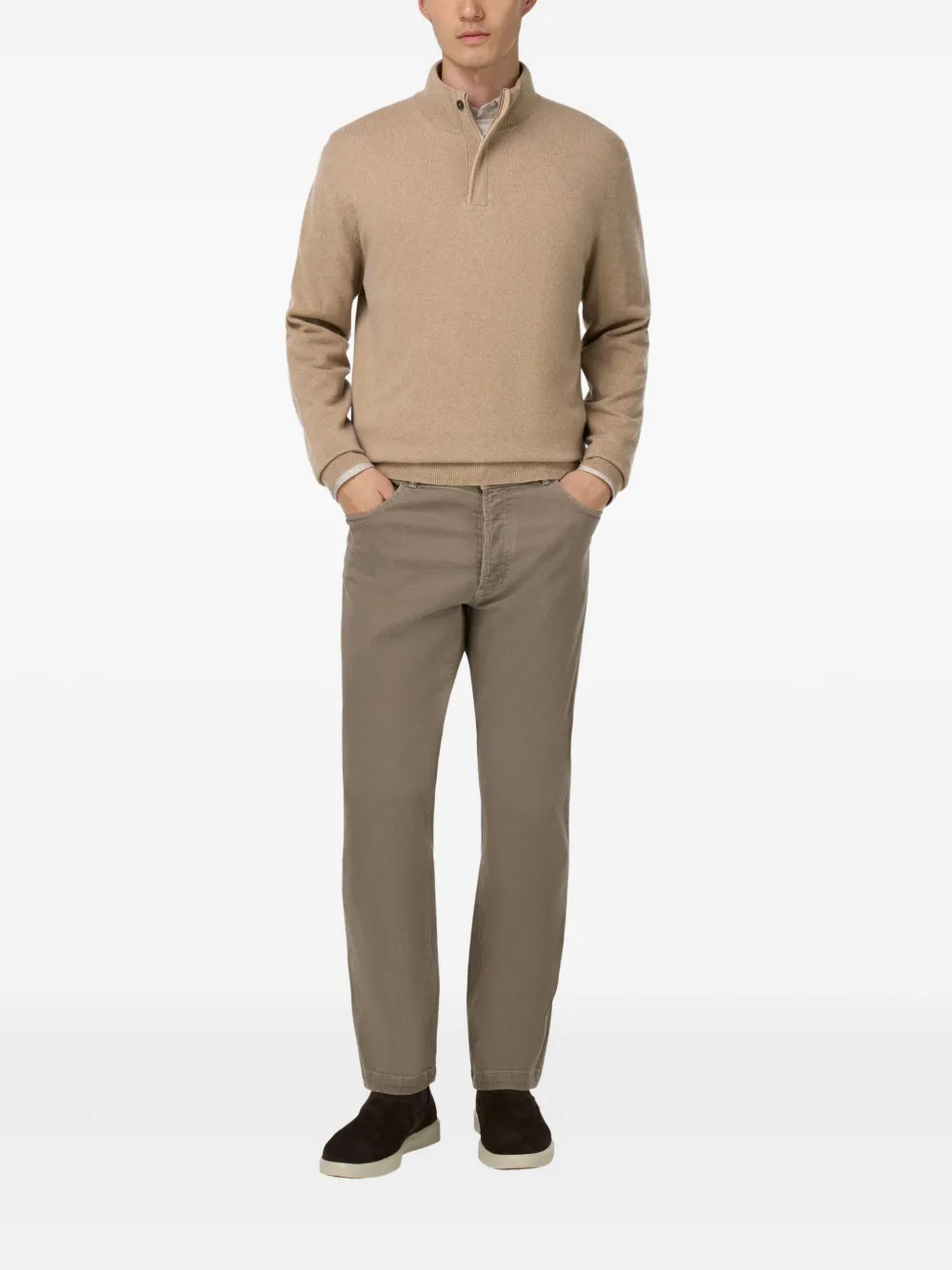 бежевый свитер с высокой горловиной на полу-молнии и ребристым подолом