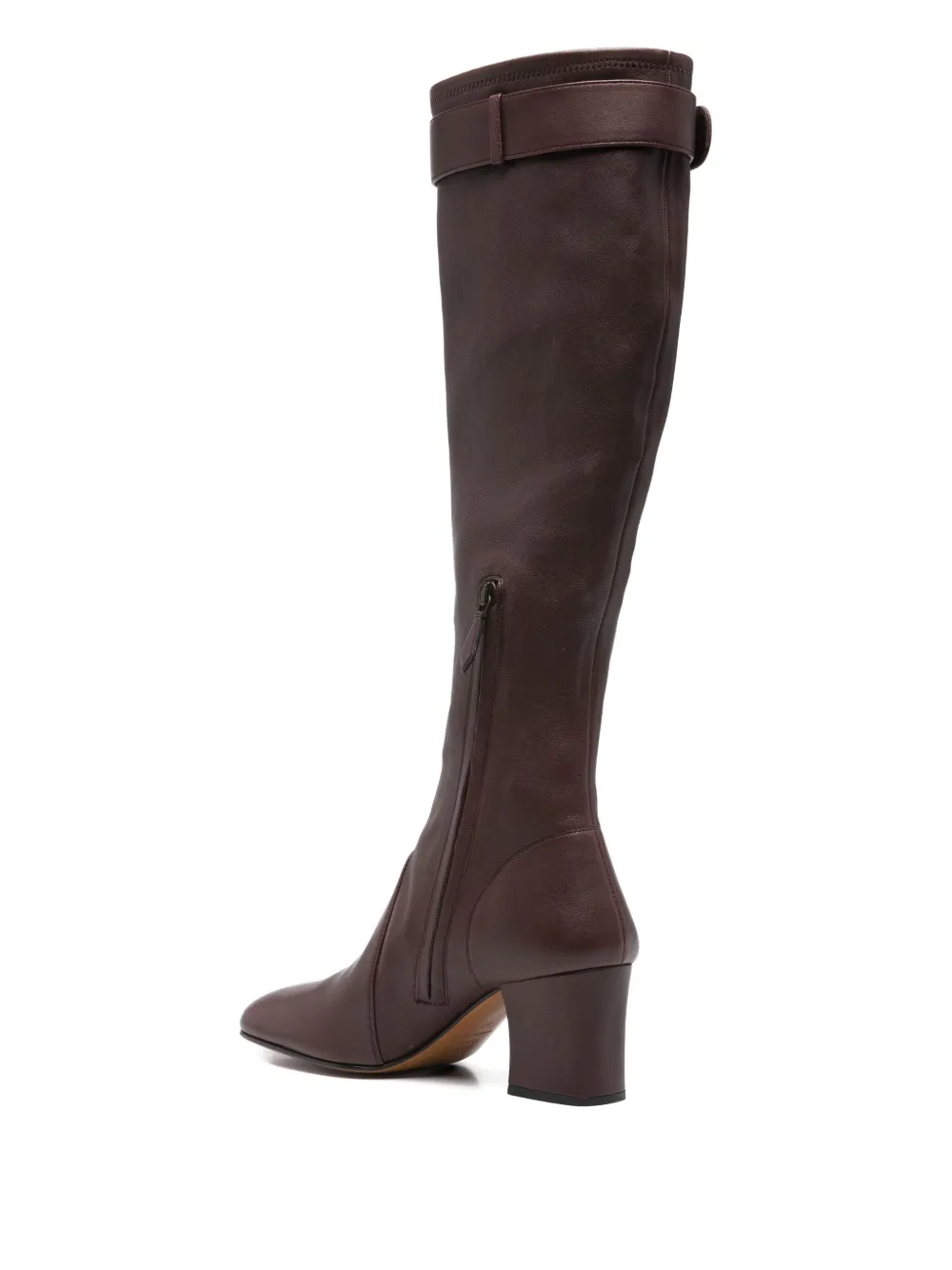 коричневые ботфорты на квадратном каблуке до колена, с боковой молнией, ремешком с застёжкой-пряжкой и квадратным носком