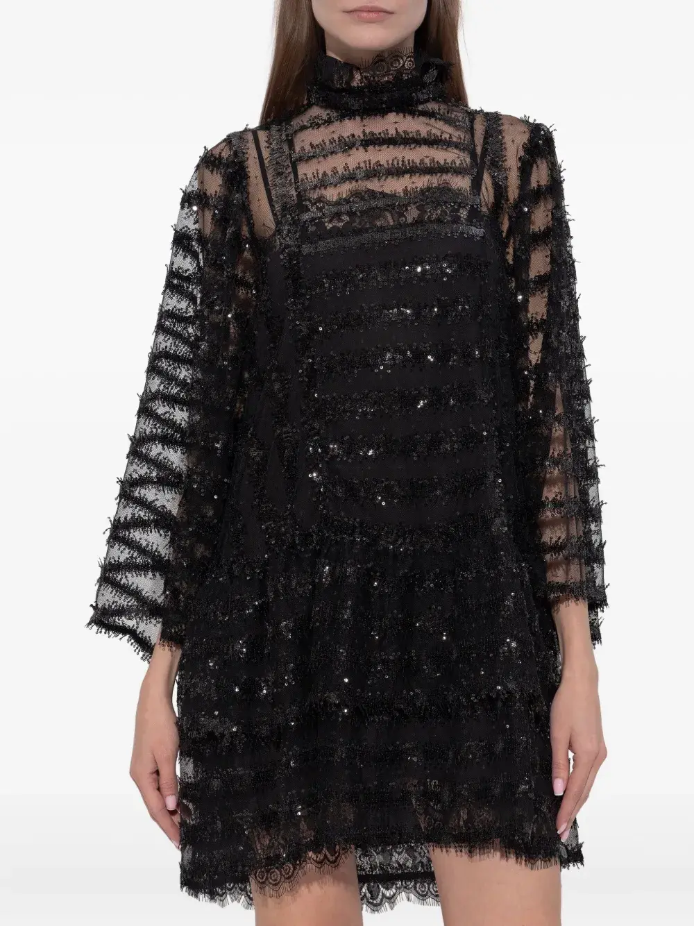 черное платье с кружевной отделкой, декорированное пайетками, с высоким воротом и длинными рукавами