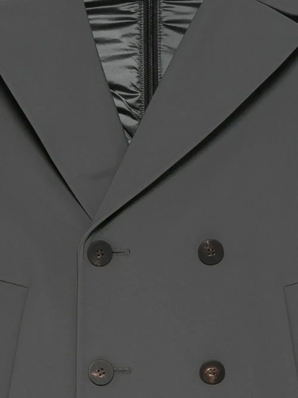 серый двубортный пиджак с застежкой на пуговицы, лацканами с вырезом, длинными рукавами и прямым подолом