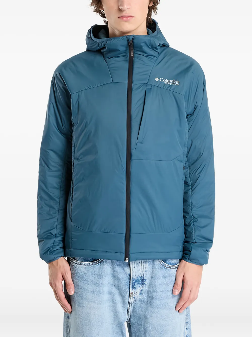 синий худи на молнии с капюшоном, нагрудным карманом, логотипом и длинными рукавами