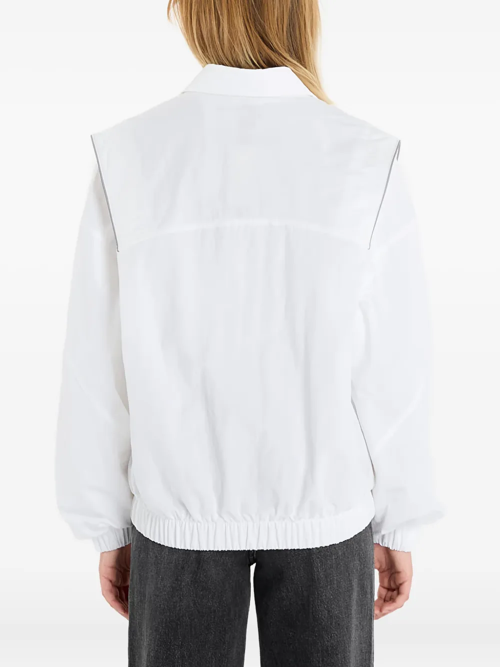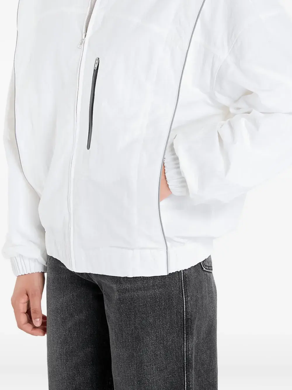 белая куртка на молнии с отложным воротником, длинными рукавами, эластичными манжетами и передним карманом на молнии