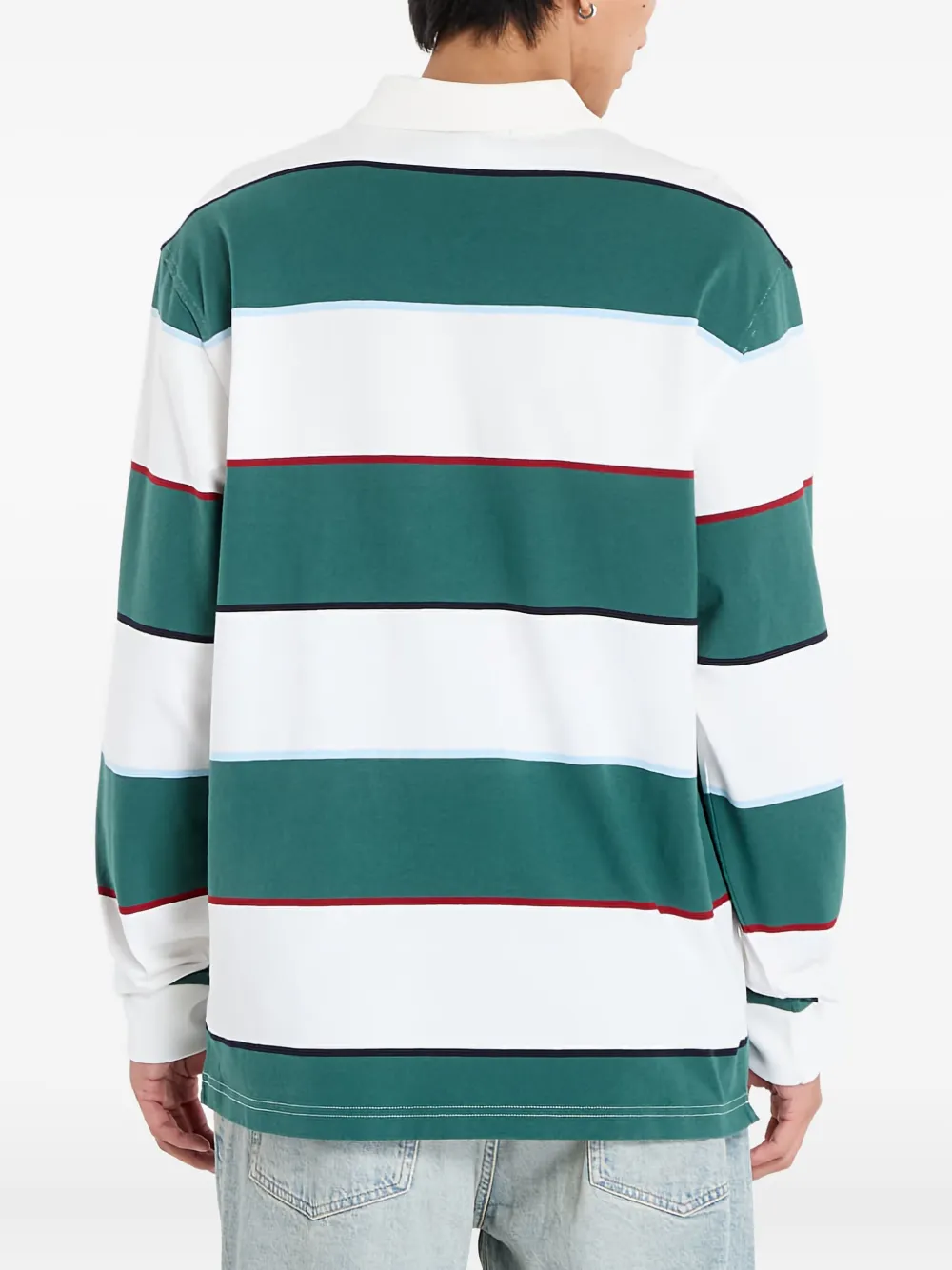 зелёно-белая хлопковая рубашка-поло в полоску с длинными рукавами, воротником-поло, вышивкой логотипа венок лавра и застёжкой на пуговицы