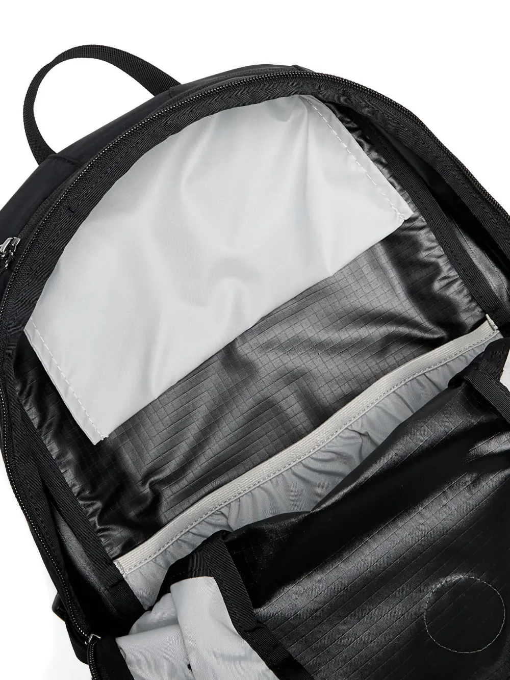 черная сумка с верхней ручкой, регулируемыми ремнями, застежкой-молнией, застежкой-пряжкой и нашивкой с логотипом спереди