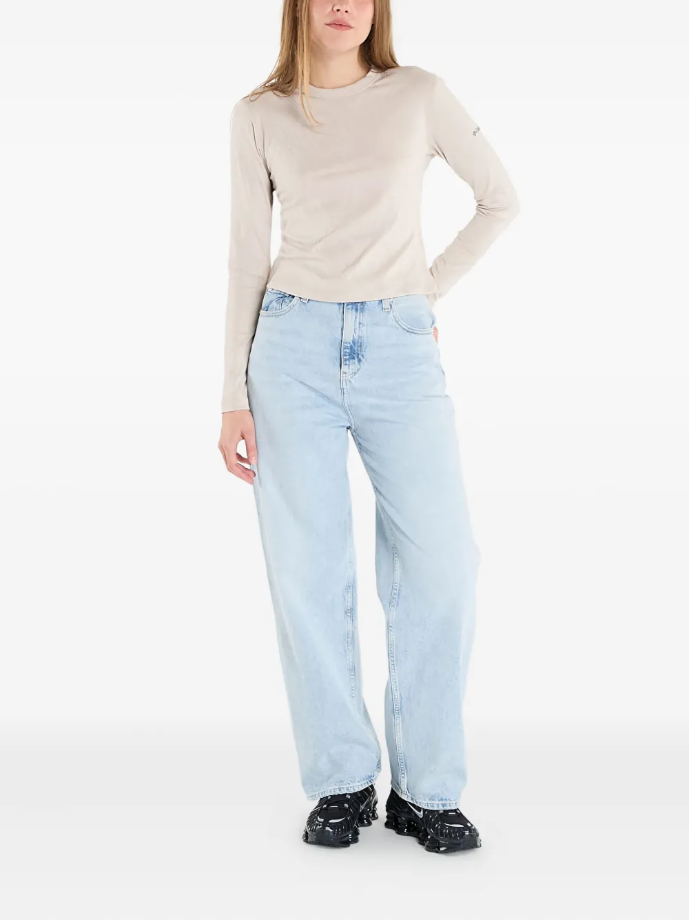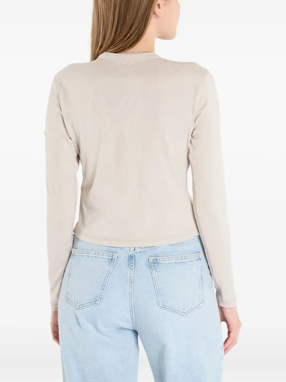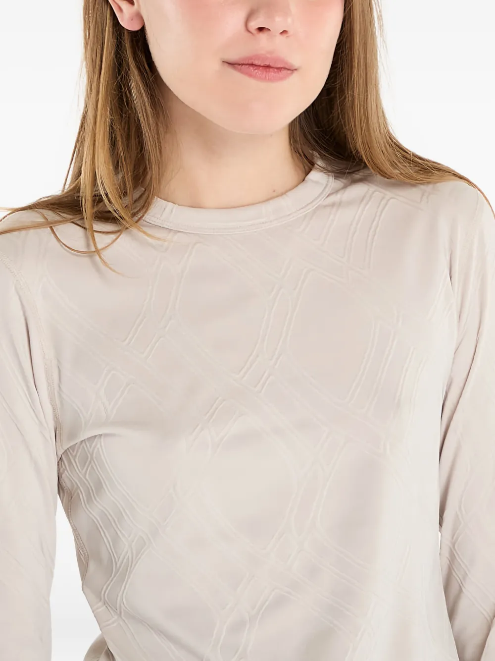 бежевый узорчатый материал, длинные рукава, круглый вырез