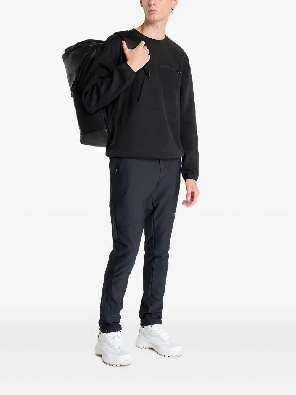 черная модель с логотипом, застежка-молния, боковая молния, комбинированный дизайн, текстура софтшелл