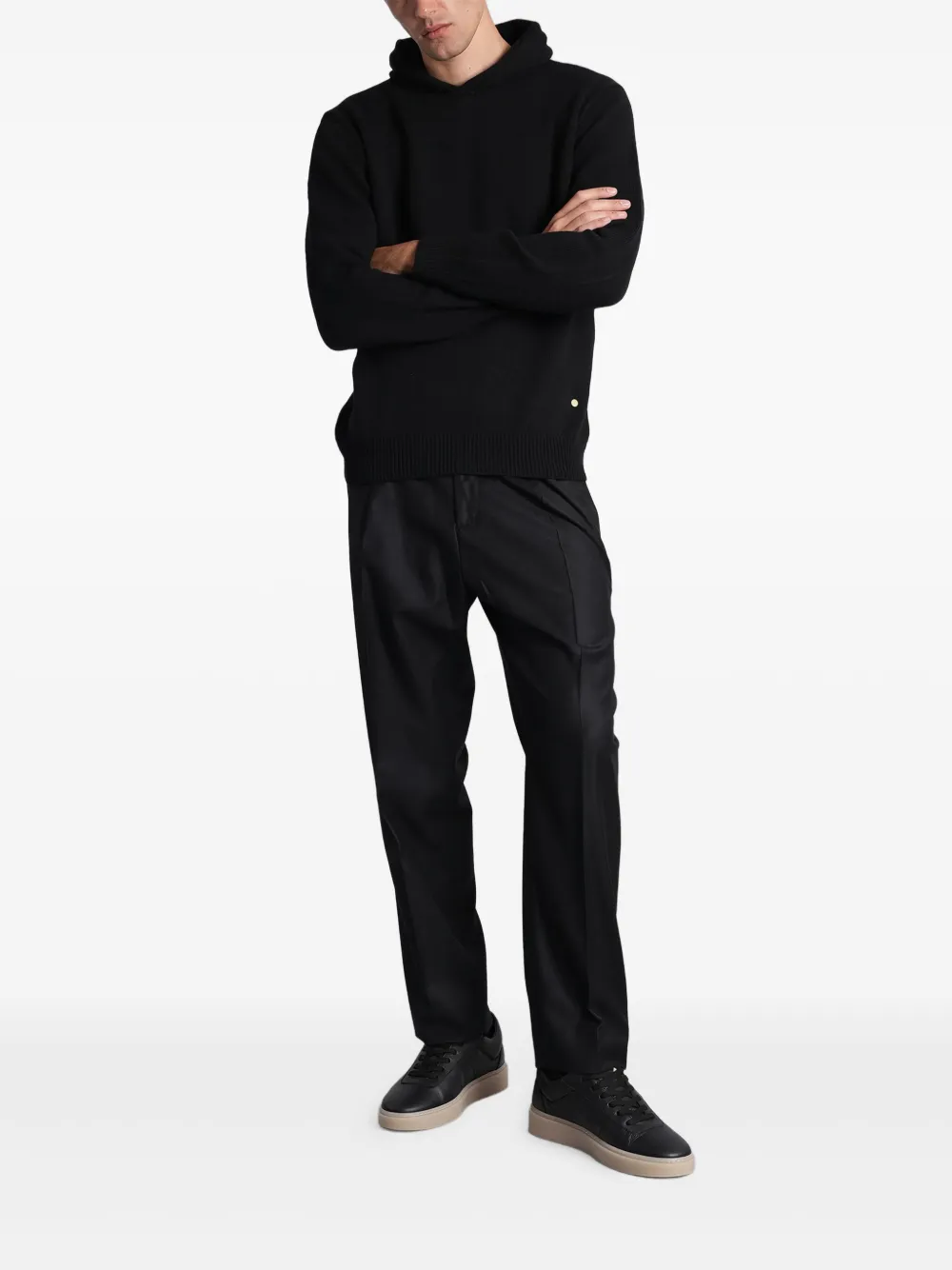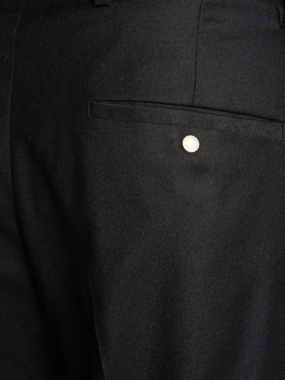 черные брюки с защипами, задним карманом с пуговицей, шлевками для ремня, скрытой застежкой и прямыми штанинами