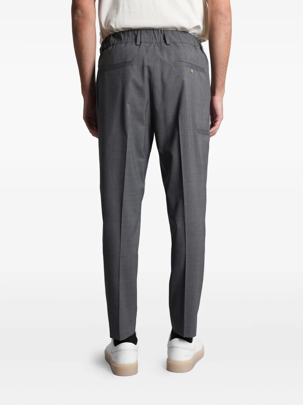 серый цвет, эластичный пояс, задний карман на пуговице, шлевки для ремня, панельная конструкция