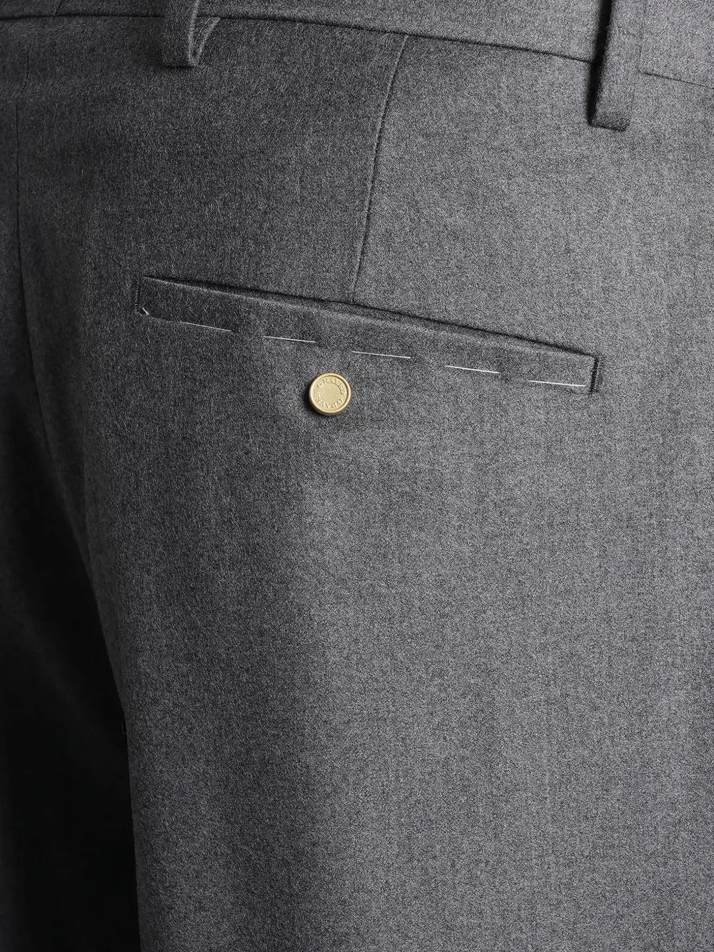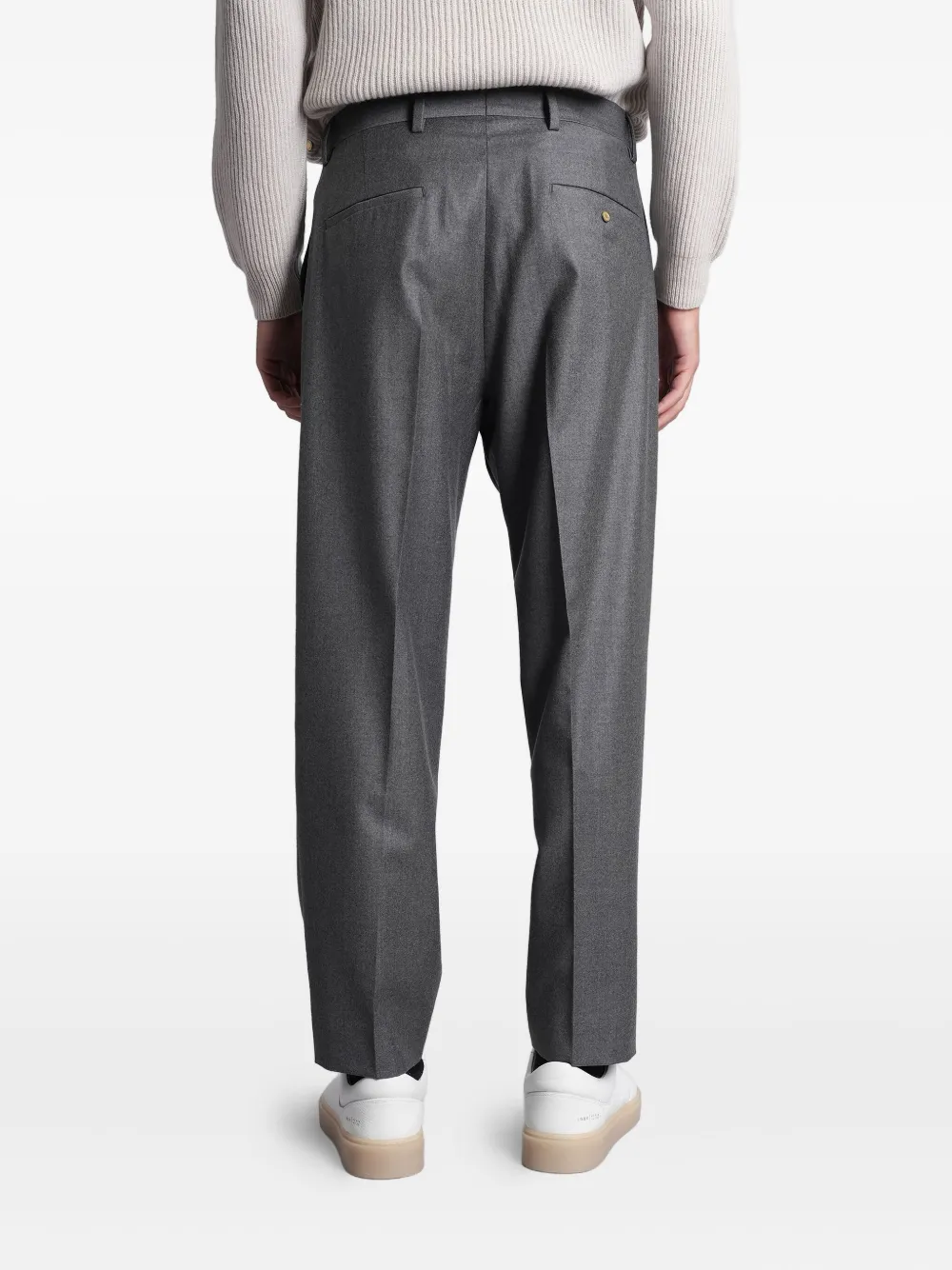 серые шлевки, застёгивающийся на пуговицу задний карман, защипы спереди, потайная застёжка
