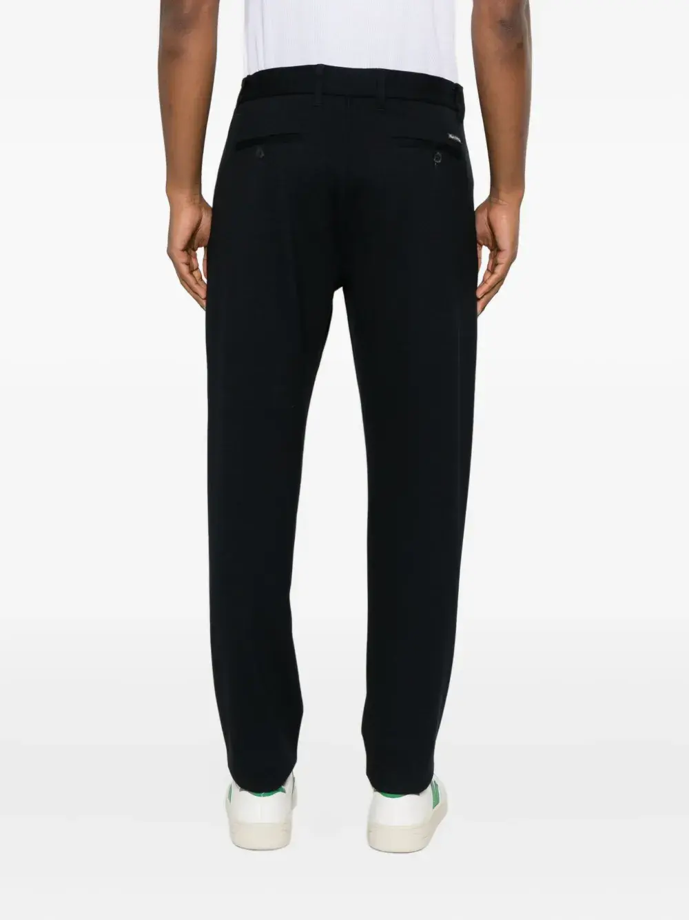 глубокий ночной синий, складки спереди, застежка на пуговицы, шлевки для пояса, боковые карманы, задние прорезные карманы
