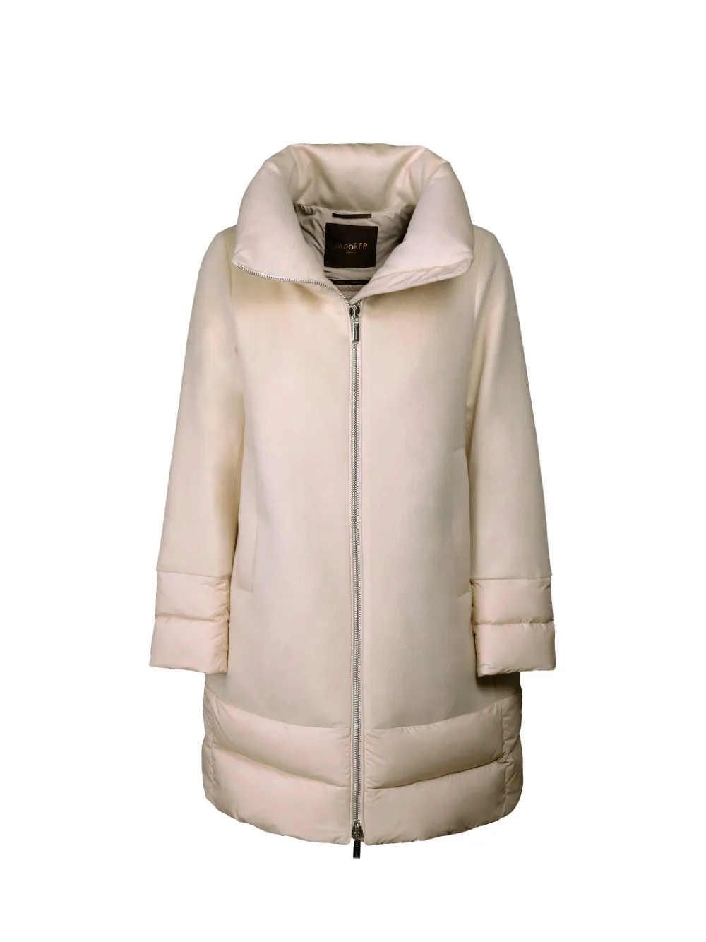 кремовый цвет, стеганый дизайн, высокий воротник, застежка на молнию, длинные рукава, два боковых кармана, простеганные панели