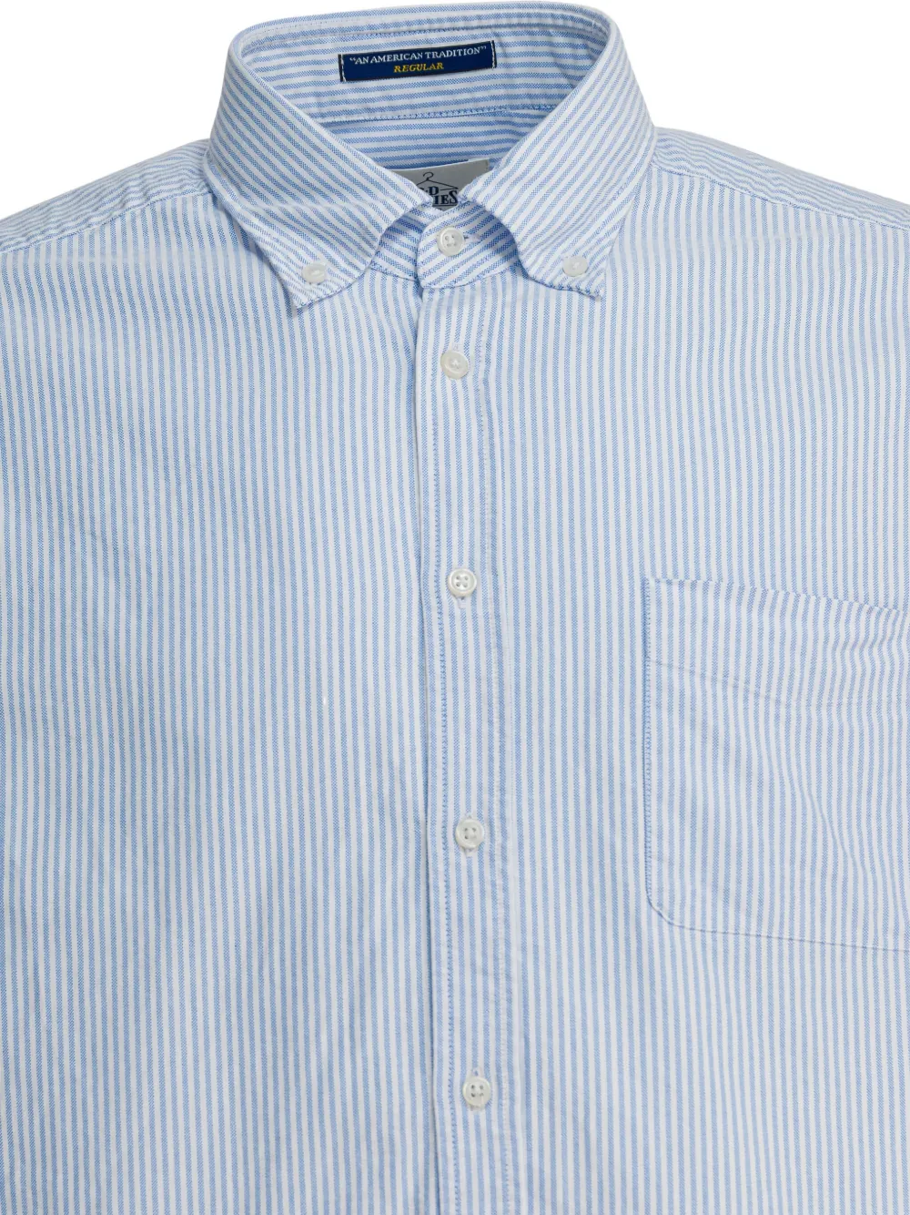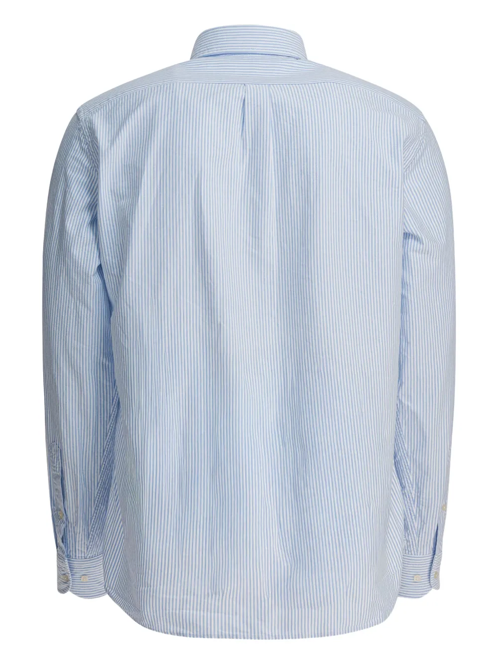 синий, в полоску, нагрудный карман, застёжка на пуговицы, воротник на пуговицах, длинные рукава