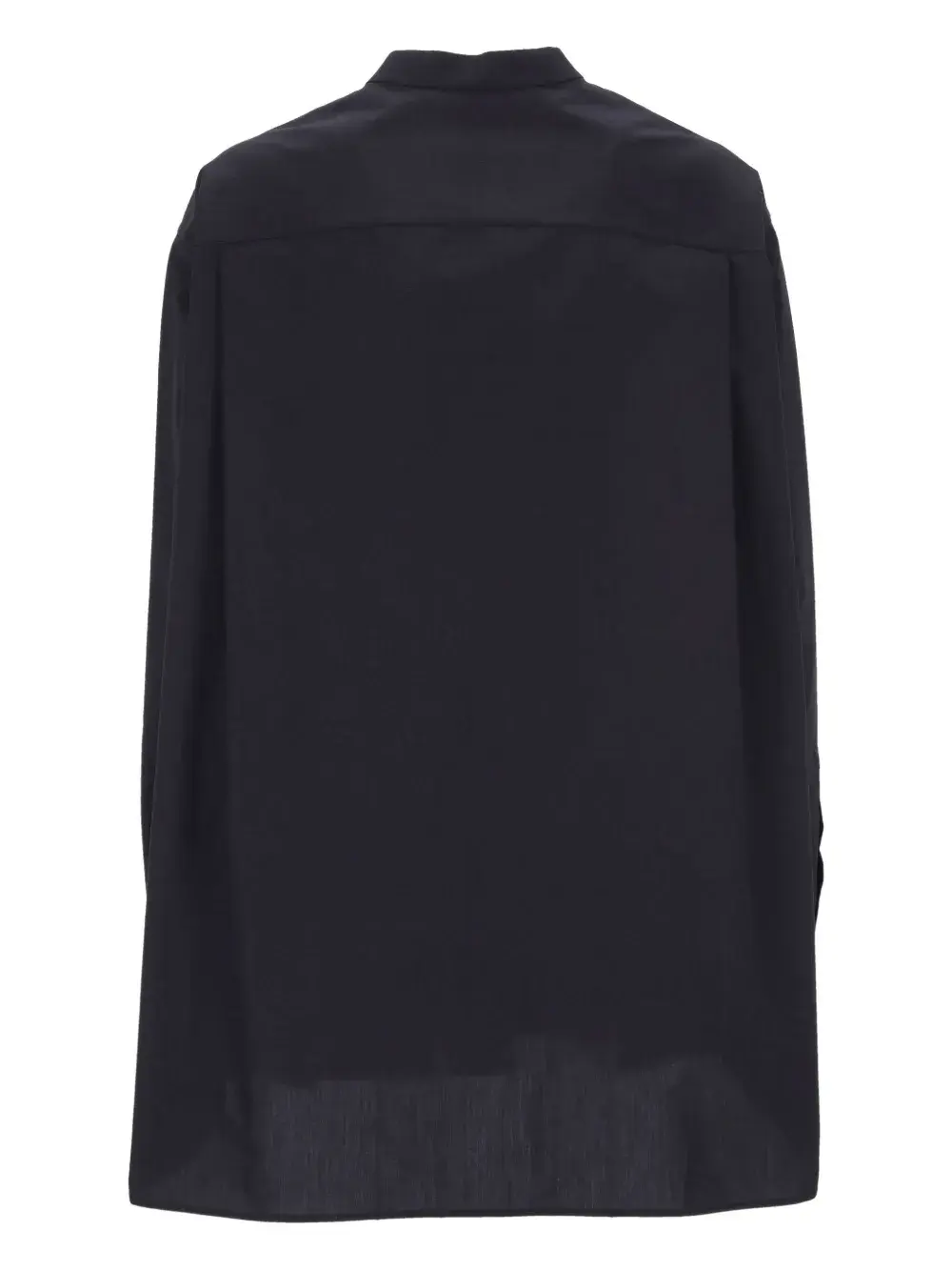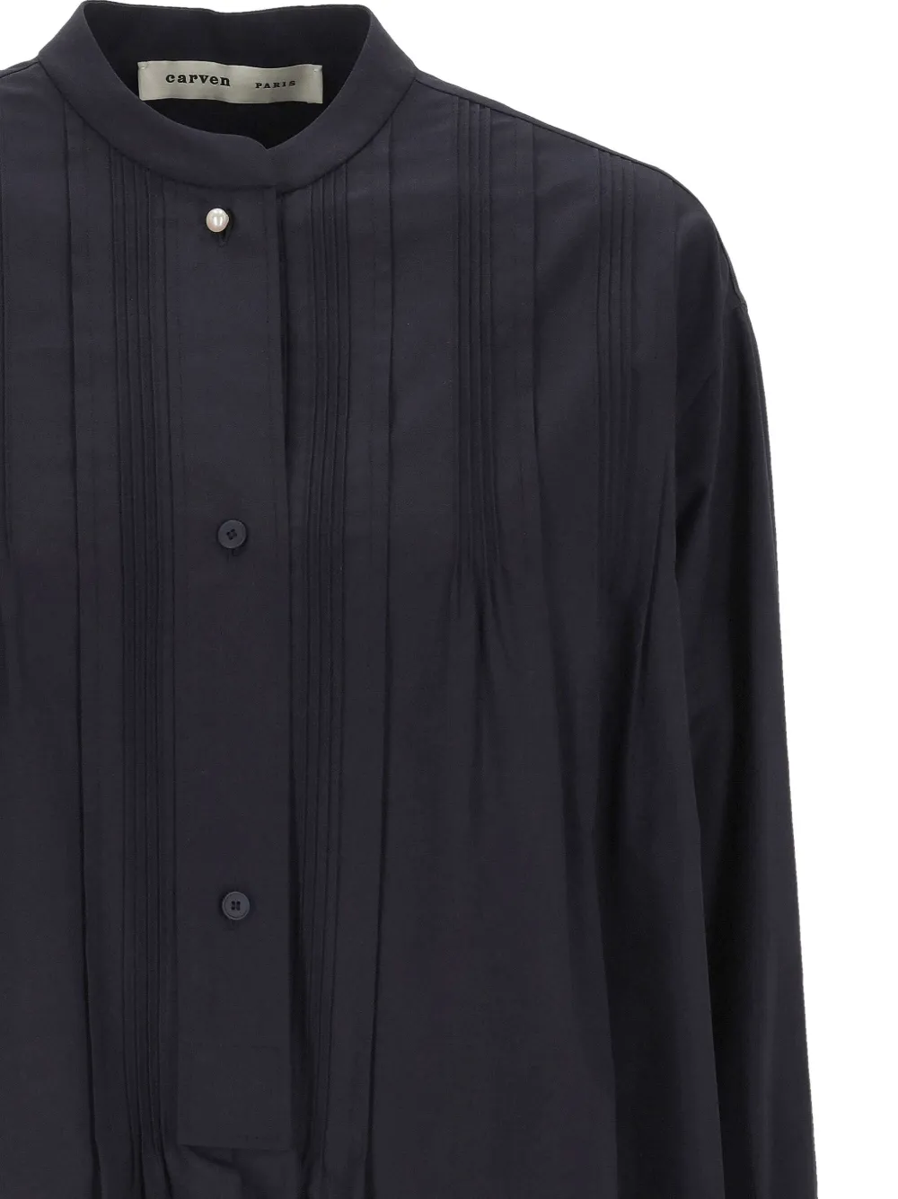 темно-синий, плиссированные детали, застежка на пуговицы, длинные рукава, стойка-воротник