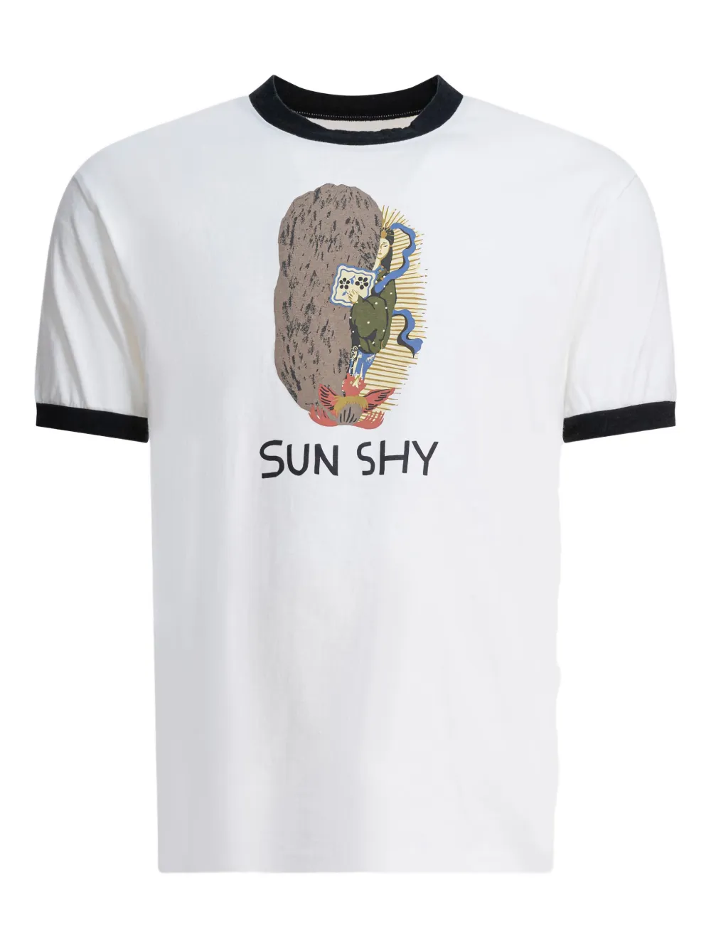 белая футболка с графическим принтом, контрастным воротником, короткими рукавами, рубчатой отделкой и круглым вырезом