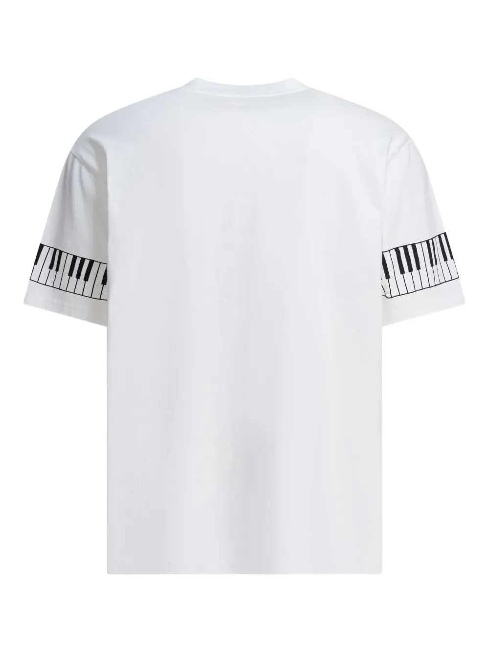 белая футболка с короткими рукавами, круглым вырезом и дизайном в виде клавиш пианино