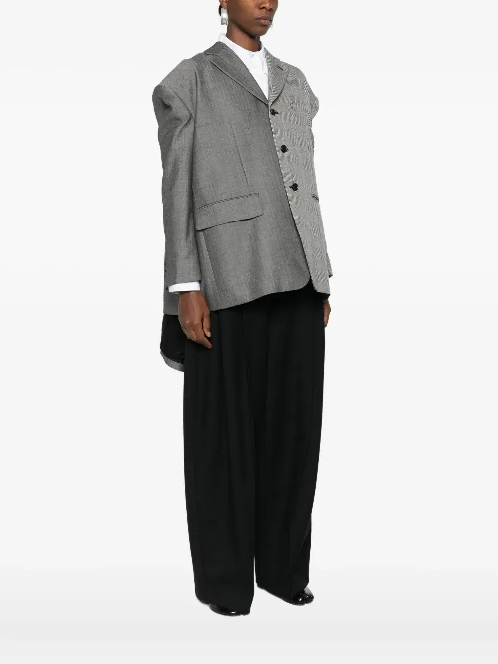 серый клетчатый узор, узор «елочка», застежка на пуговицы, накладные карманы с клапанами спереди, длинные рукава
