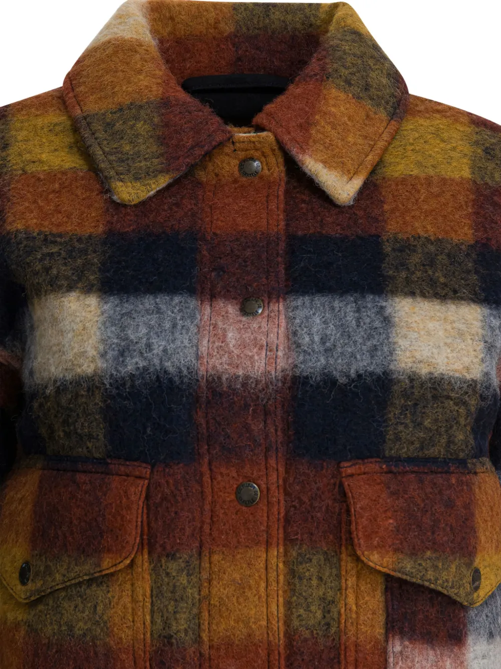 коричневый клетчатый узор, воротник на пуговицах, застёжка на пуговицы, нагрудные карманы, карманы с клапанами