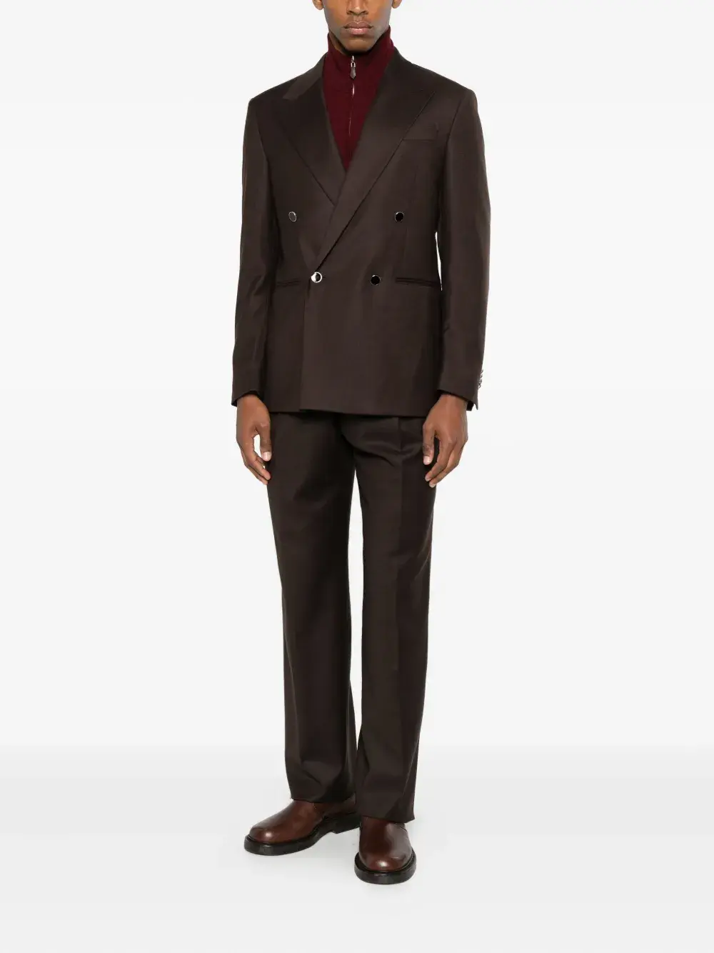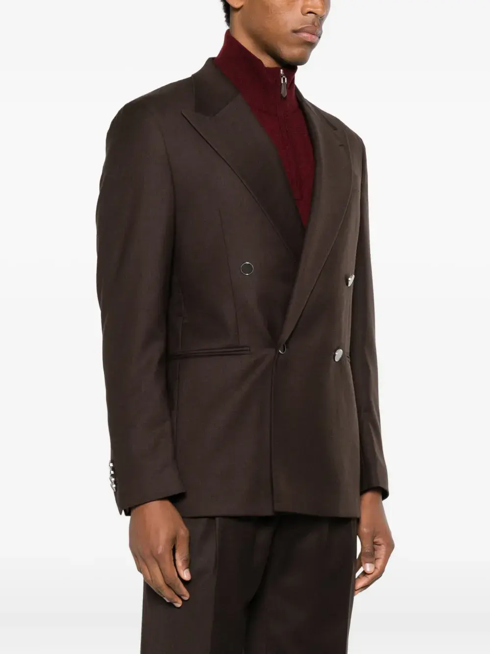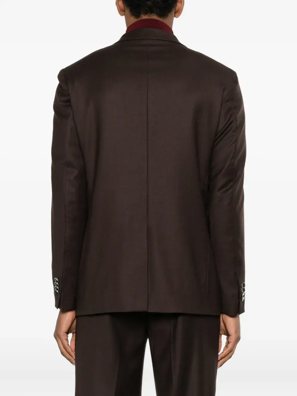 темно-коричневый, двубортная застёжка на пуговицах, лацканы с острыми концами, длинные рукава, манжеты на пуговицах