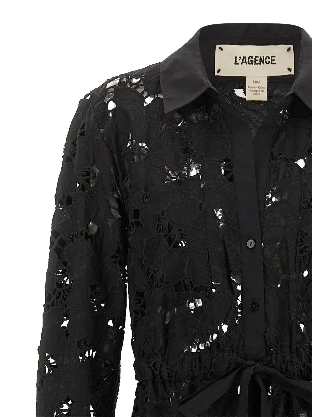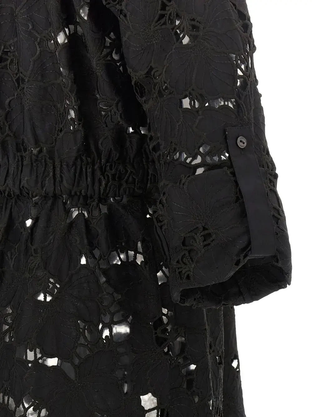 черный с цветочным кружевом, застежка на пуговицы спереди, эластичный пояс на завязке, длинные рукава с манжетами