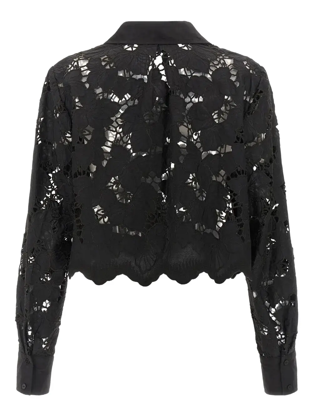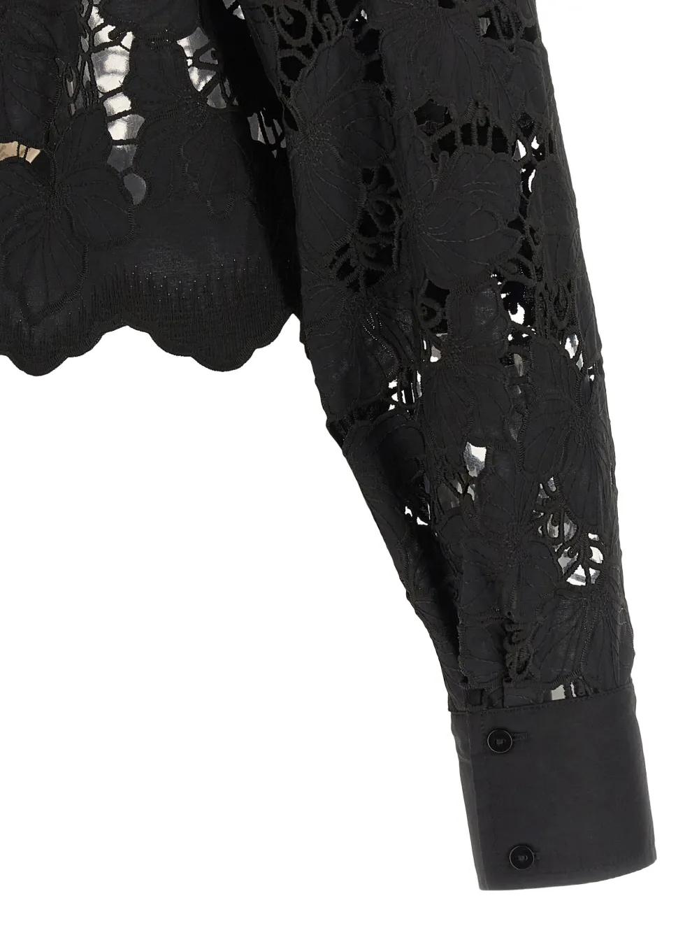 черные кружевные детали, асимметричный подол, застежка на пуговицы, длинные рукава с манжетами, без подкладки