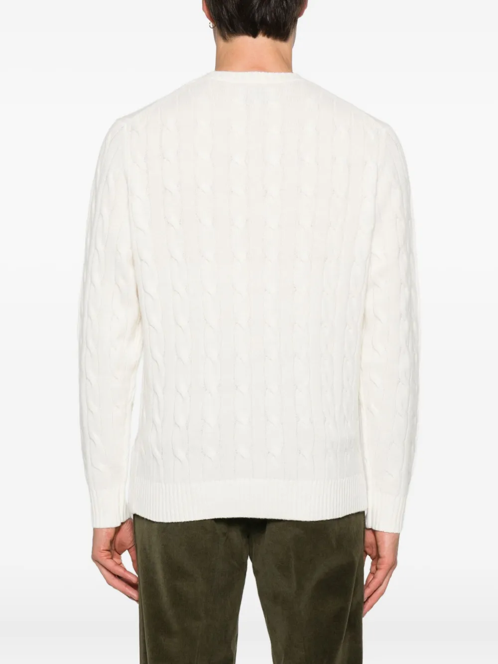 молочно-белый цвет, отделка в виде косы, ребристый низ, ребристые манжеты, длинные рукава, круглый вырез