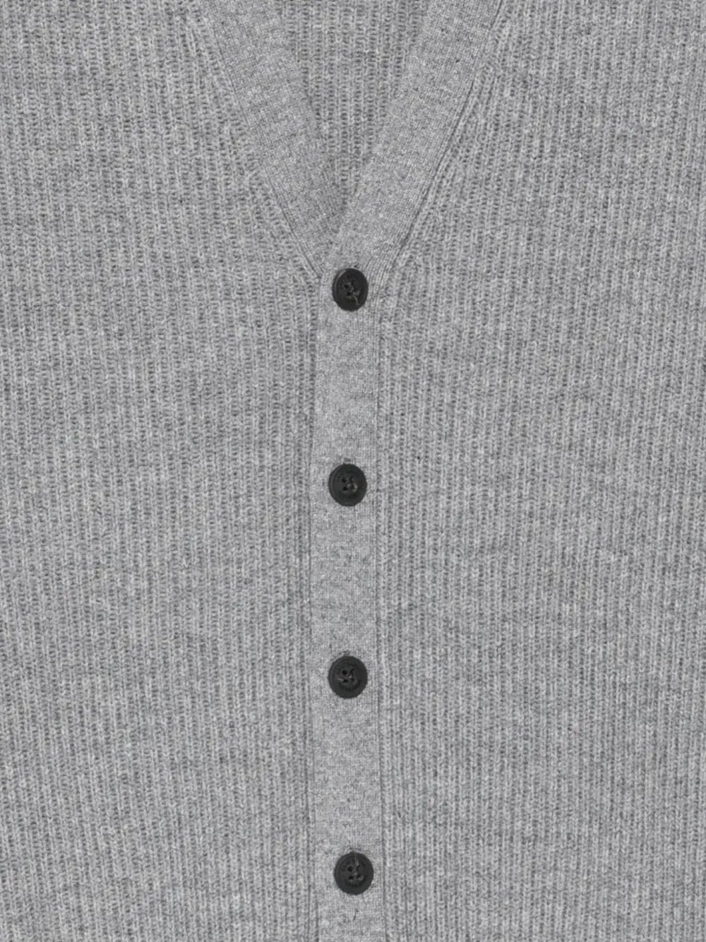 серый вязаный кардиган в рубчик с V-образным вырезом, застежкой на пуговицы, длинными рукавами и прямым подолом