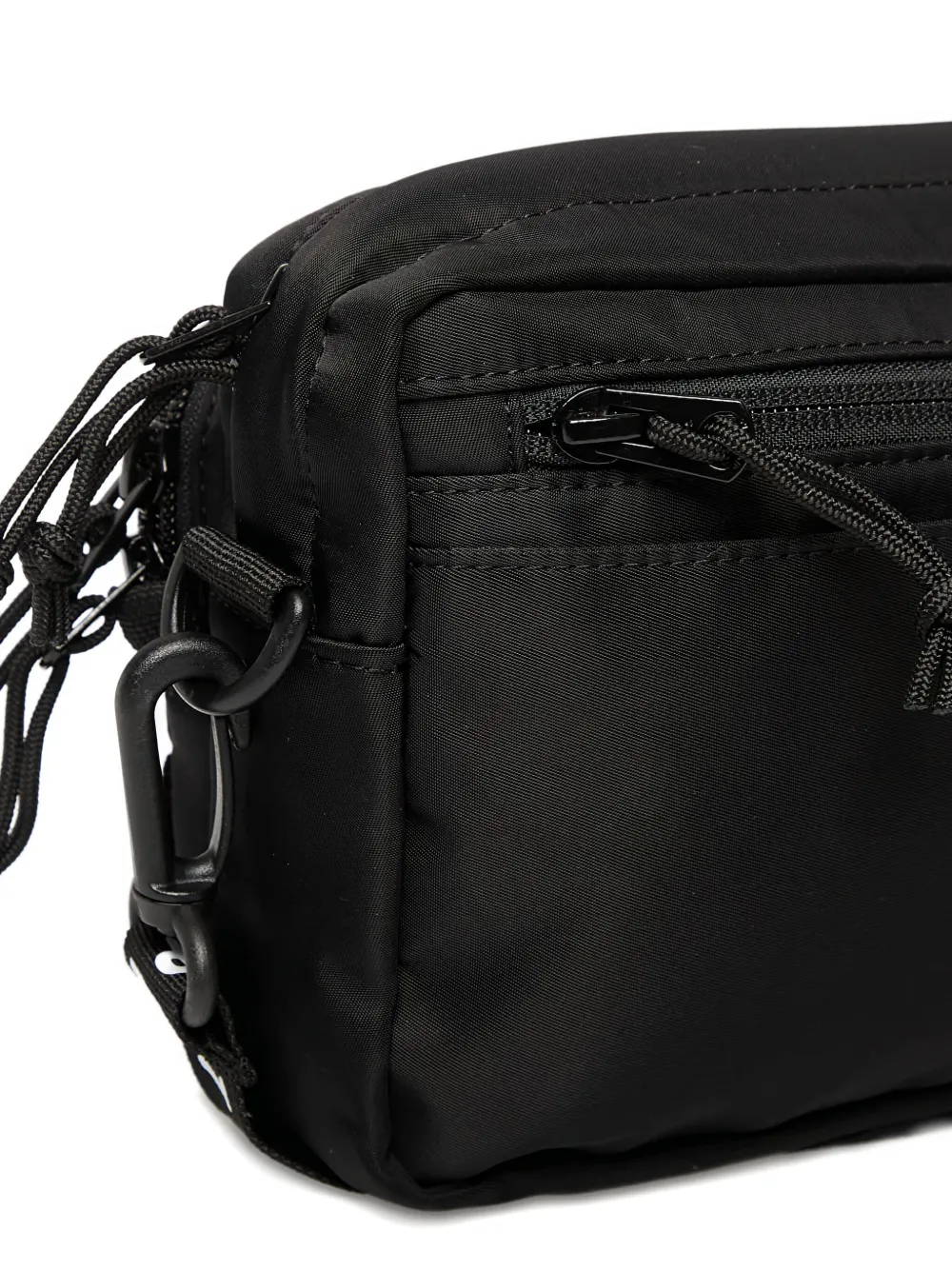 черный топ, застежка-молния сверху, передний карман на молнии, наплечный ремень, карабин, нашивка с логотипом
