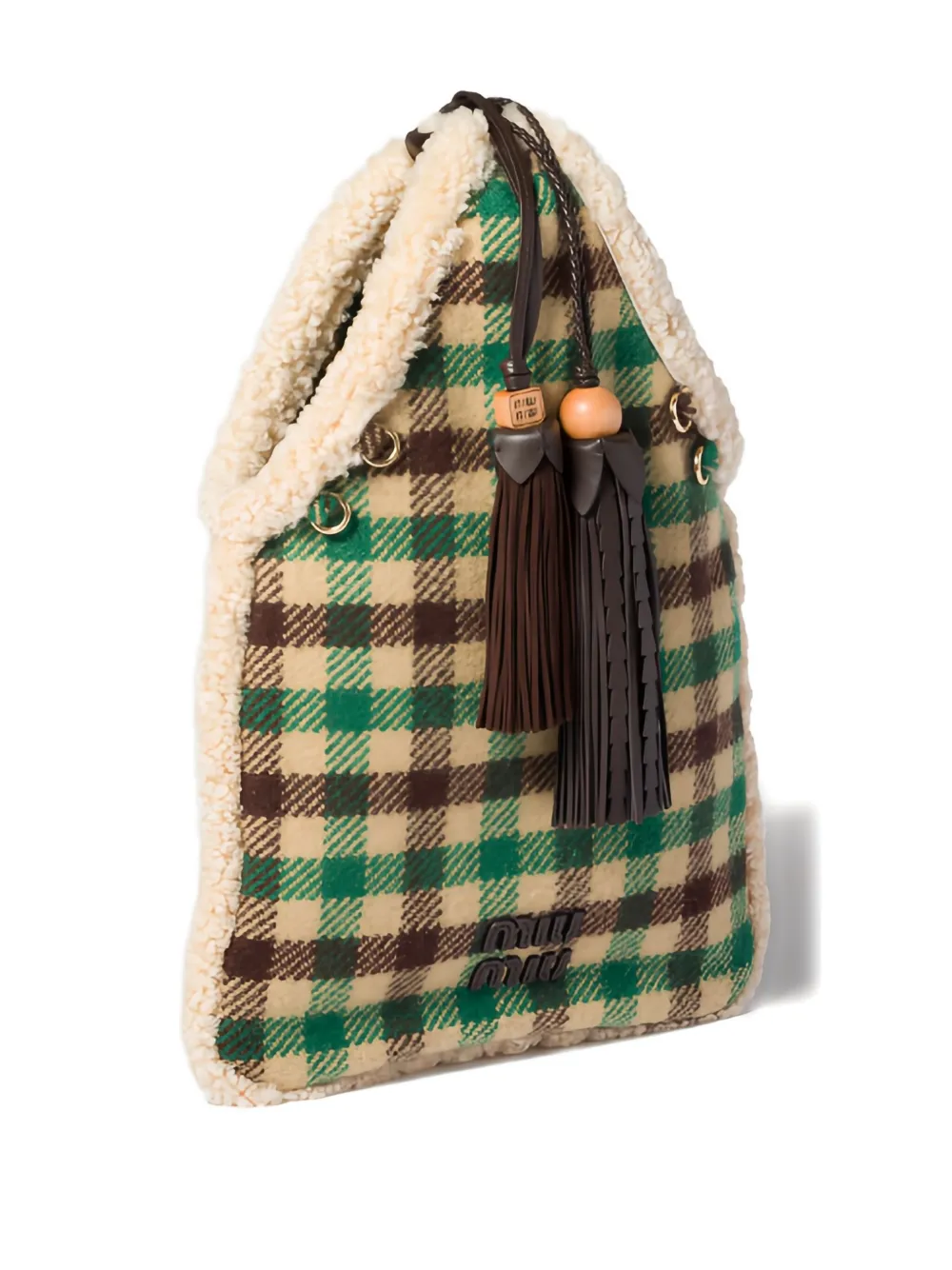 многоцветная сумка с клетчатым узором, отделкой из овчины, бахромой, верхней ручкой и фурнитурой золотистого оттенка