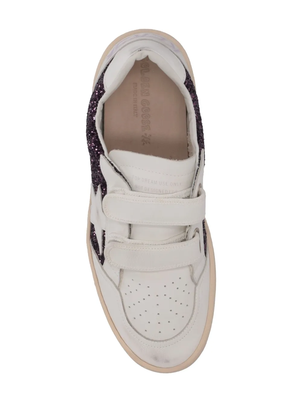 белые кожаные кроссовки с блестящими звёздами, декоративными вставками и застёжками на ремешках