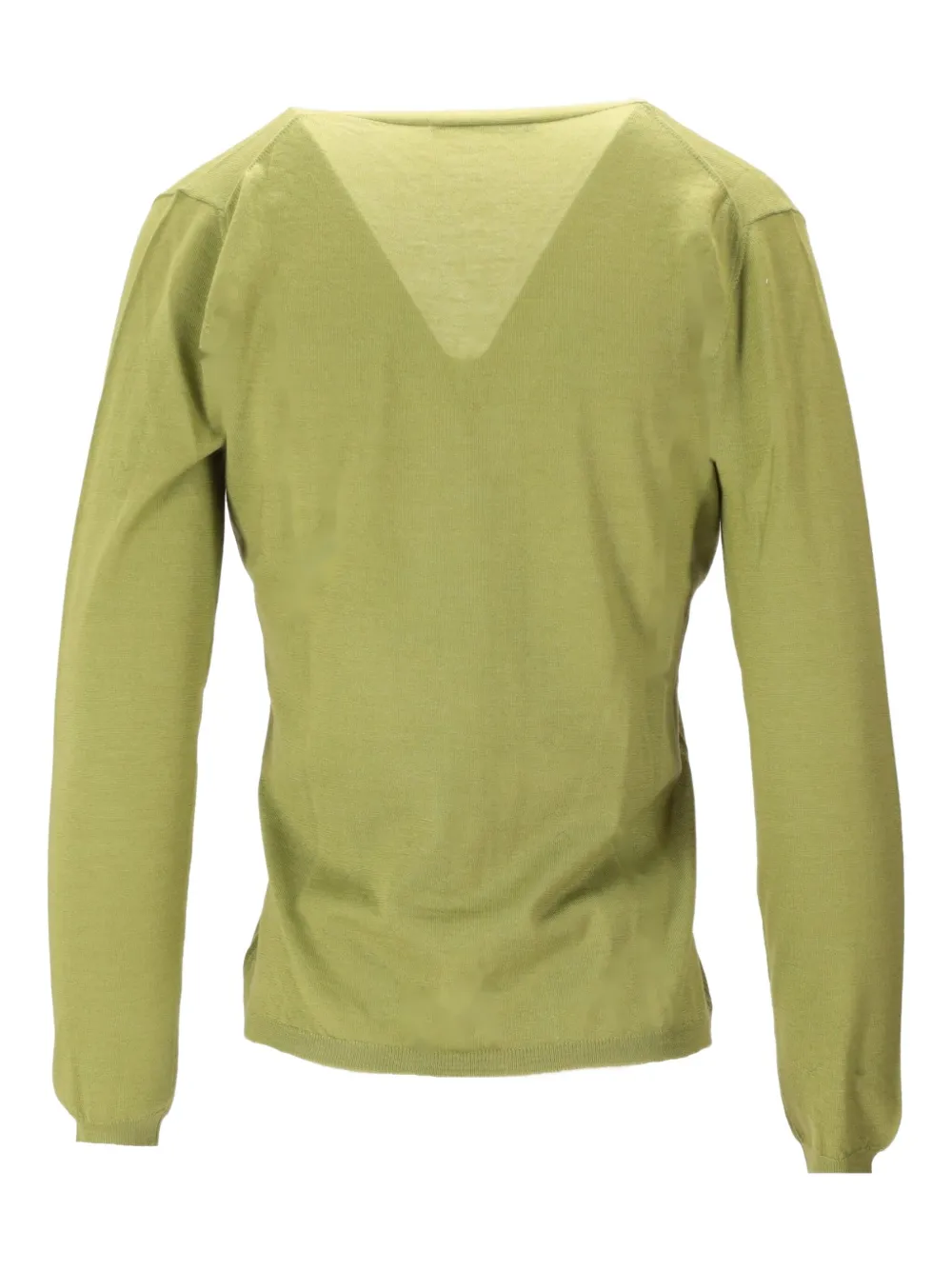 зеленый цвет, V-образный вырез, застежка на пуговицы спереди, длинные рукава, манжеты в рубчик, низ в рубчик