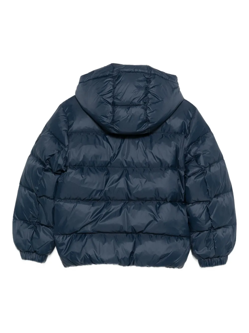 синяя стеганая куртка с капюшоном, застежкой-молнией, логотипом и длинными рукавами