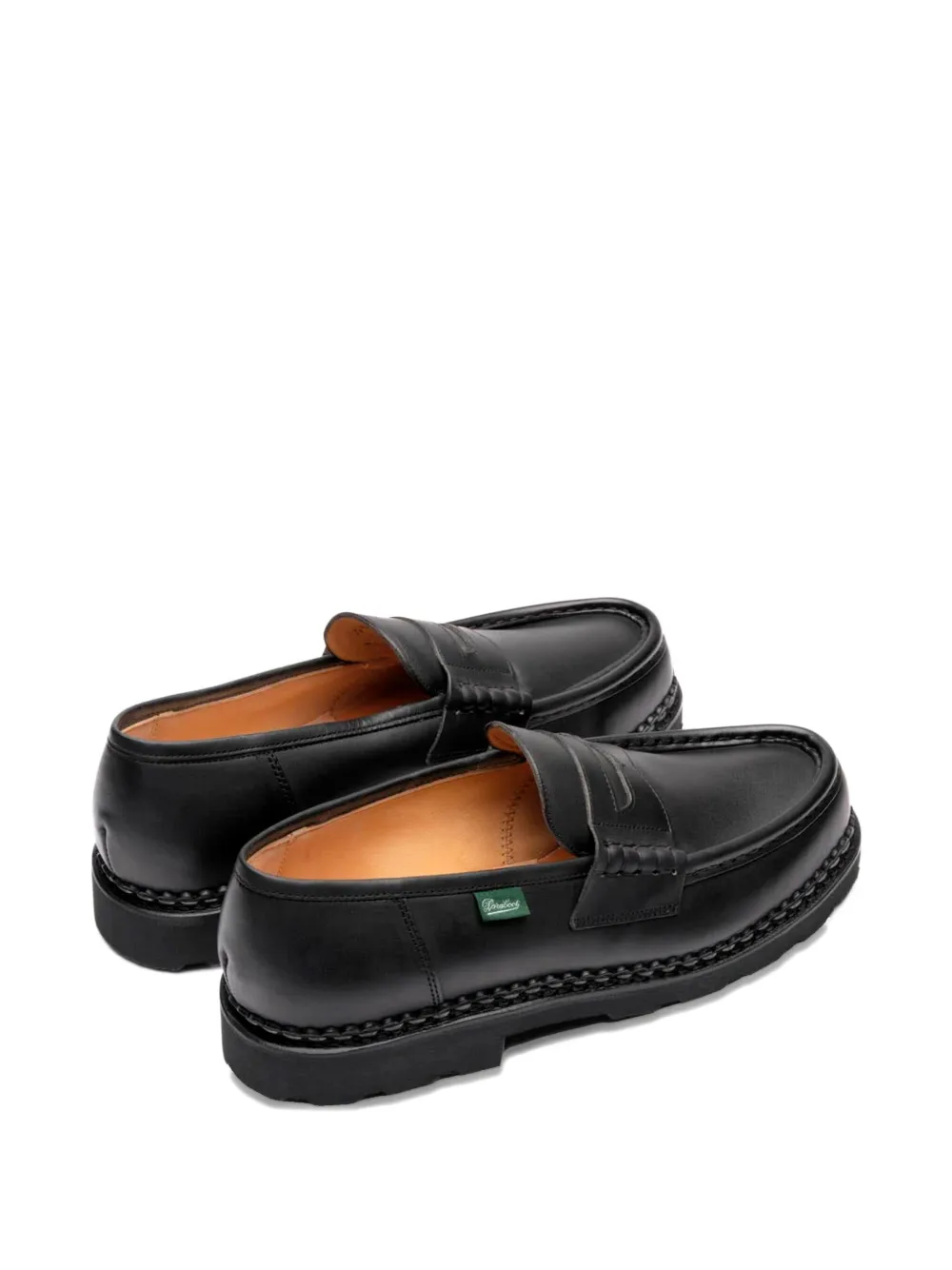 черная кожаная конструкция, перемычка-пенни, прошитый рант, рифленая подошва, низкий каблук