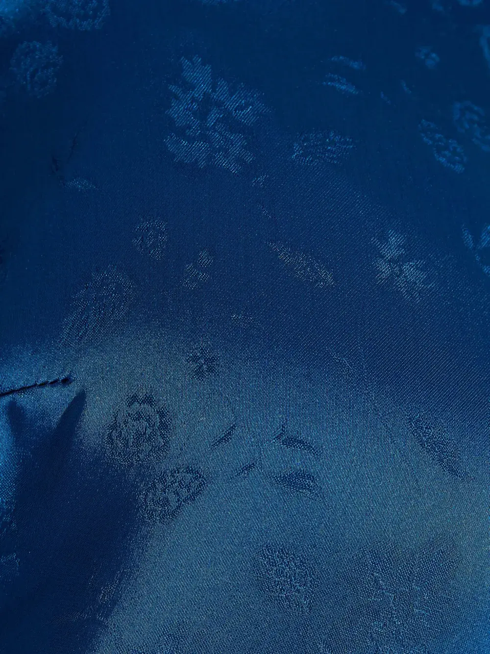 синяя атласная блуза с круглым вырезом, завязкой сзади и длинными пышными рукавами