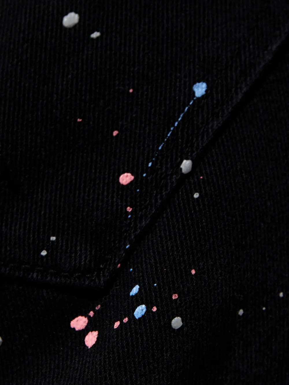чёрные детали с эффектом брызг краски, шлёвки для ремня, пять карманов, нашивка с логотипом, застёжка на пуговицу и молнию, подогнутый край