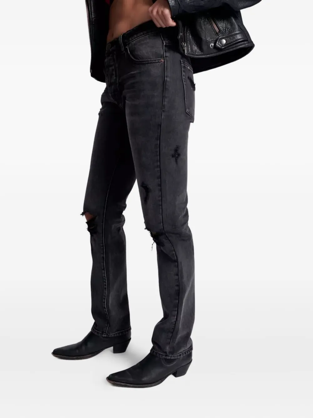 чёрный, застёжка на пуговицу, шлёвки для ремня, пять карманов, эффект потертости