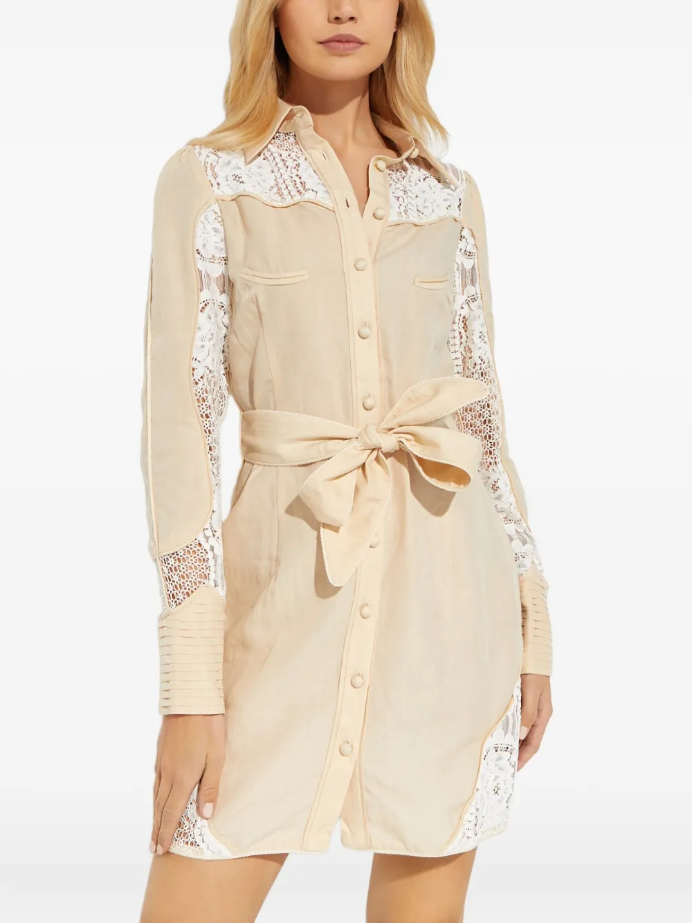 бежевый, с кружевными деталями, вышивкой, застежкой на пуговицы, с поясом