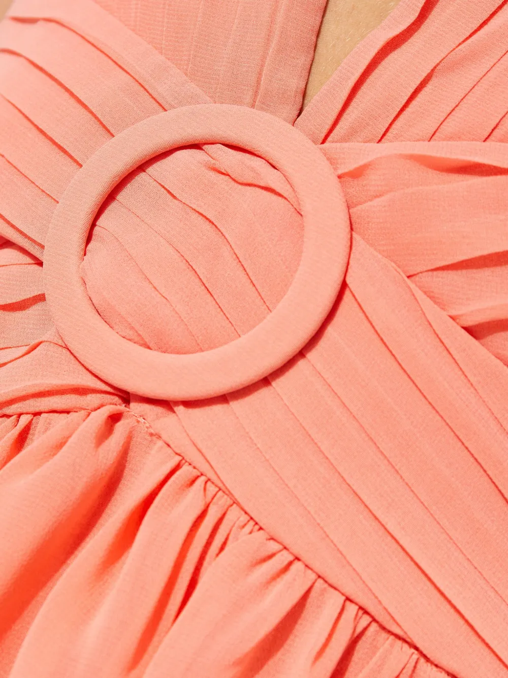 оранжевое платье с V-образным вырезом, многослойными воланами, завязками и застежкой на спине, а также рюшей по подолу