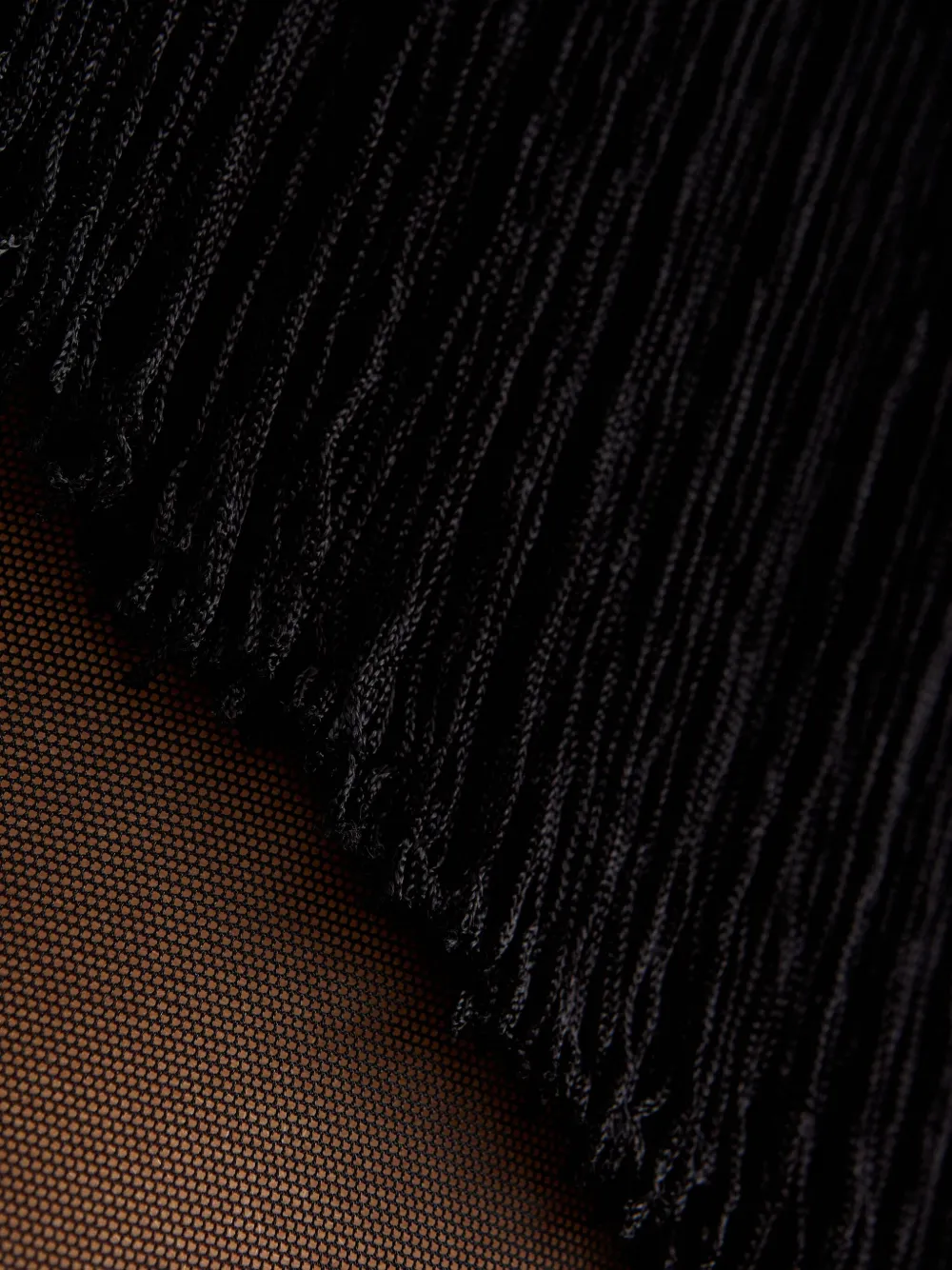 черное платье с бахромой, украшением, асимметричным подолом и дизайном на одно плечо